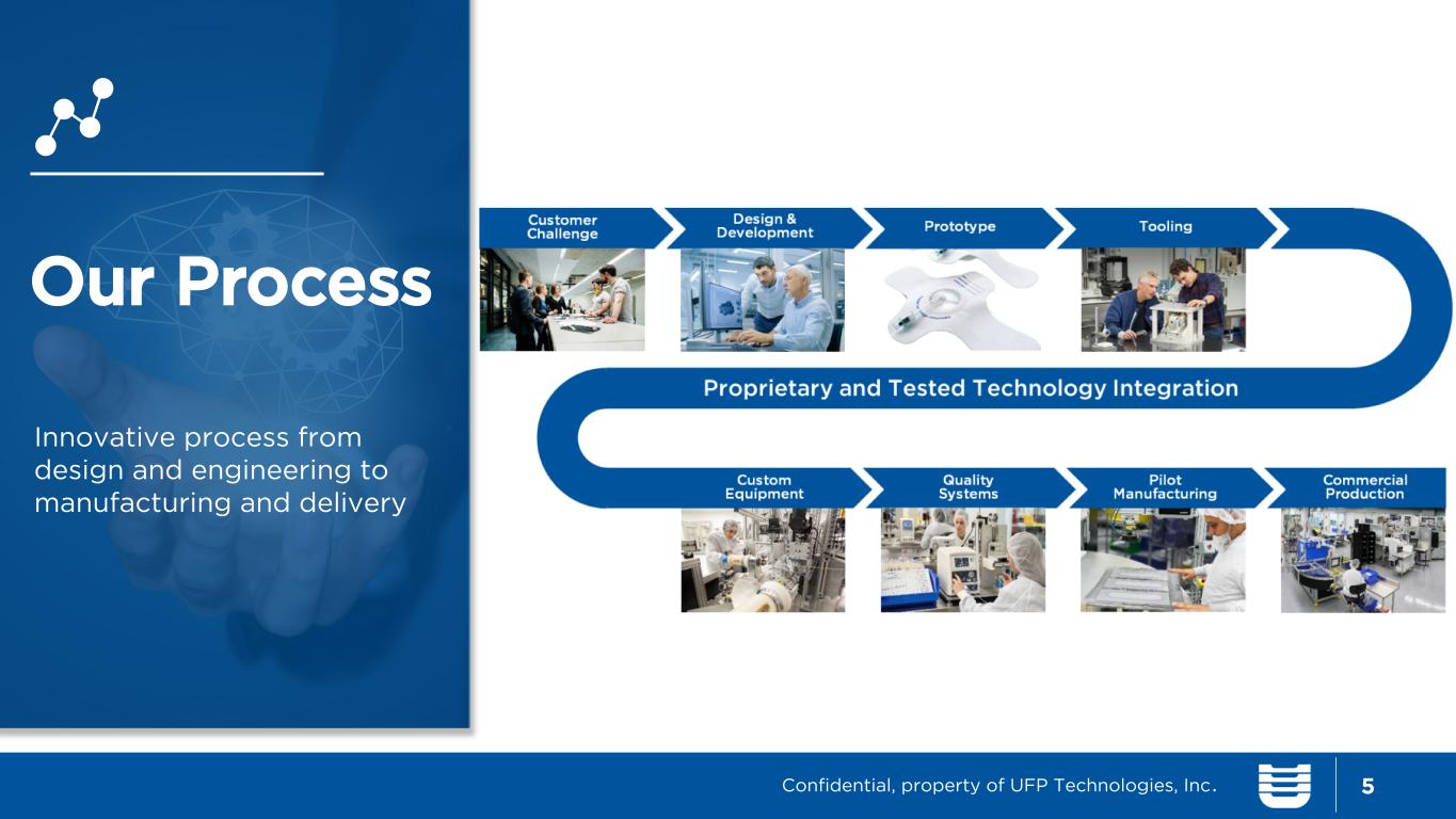 We help our customers get their medical devices to market by offering expertise in design, materials, and global manufacturing locations 4 Design & engineering capabilities Materials expertise Strategic locations Precision manufacturing Shaping Innovation Confidential, property of UFP Technologies, Inc.