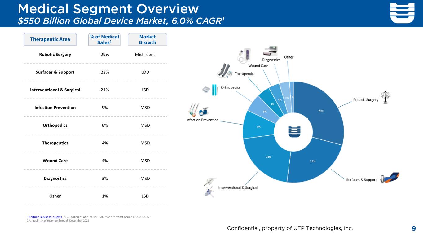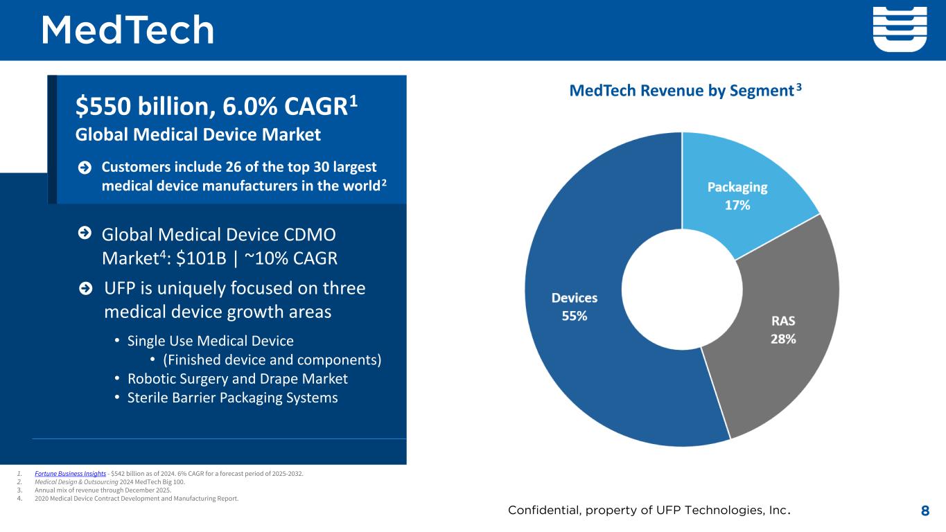 $550 billion, 6.0% CAGR1 Global Medical Device Market Customers include 26 of the top 30 largest medical device manufacturers in the world2 1. Fortune Business Insights - $542 billion as of 2024. 6% CAGR for a forecast period of 2025-2032. 2. Medical Design & Outsourcing 2024 MedTech Big 100. 3. Annual mix of revenue through December 2025. 4. 2020 Medical Device Contract Development and Manufacturing Report. MedTech MedTech Revenue by Segment3 Global Medical Device CDMO Market4: $101B | ~10% CAGR • Single Use Medical Device • (Finished device and components) • Robotic Surgery and Drape Market • Sterile Barrier Packaging Systems UFP is uniquely focused on three medical device growth areas 8 Devices 55% Confidential, property of UFP Technologies, Inc.