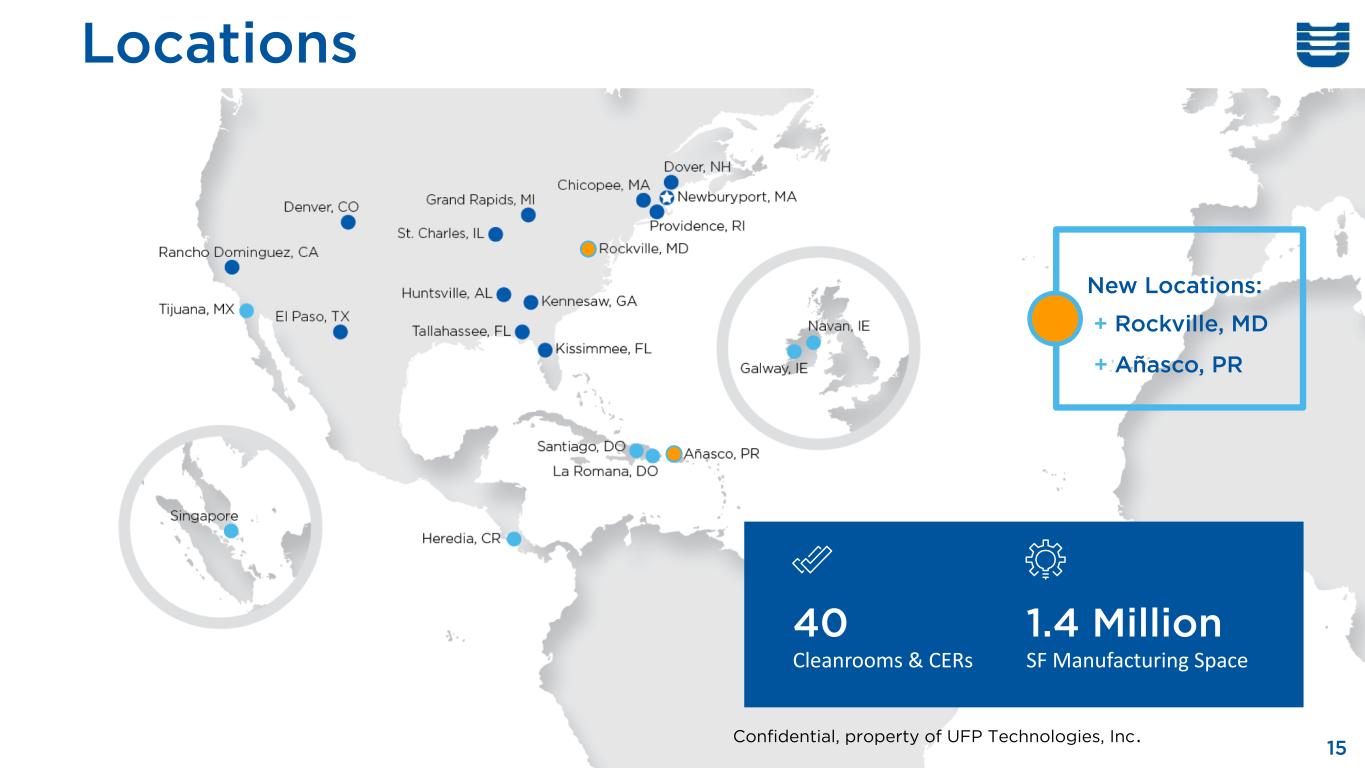 Locations 15 1.4 Million SF Manufacturing Space 40 Cleanrooms & CERs New Locations: + Rockville, MD + Añasco, PR Confidential, property of UFP Technologies, Inc.