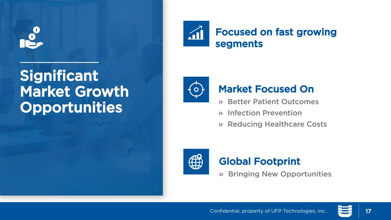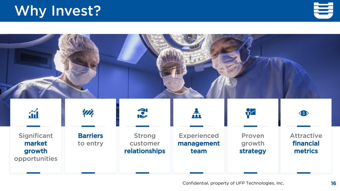 Why Invest? 16 Significant market growth opportunities Barriers to entry Strong customer relationships Experienced management team Proven growth strategy Attractive financial metrics Confidential, property of UFP Technologies, Inc.