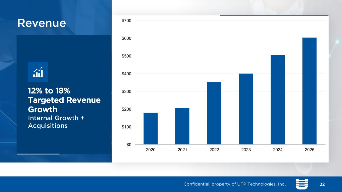 Financial Targets 21 3 to 5 Year Financial Targets 12-18% Revenue Growth 28-31% Gross Margin 17-20% Adjusted Operating Margin Confidential, property of UFP Technologies, Inc.