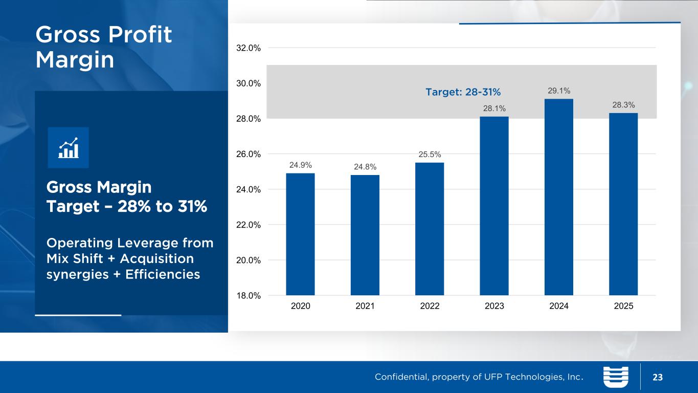 fffdkjfk12% to 18% Targeted Revenue Growth Internal Growth + Acquisitions 2020 2021 2022 2023 2024 2025 $0 $100 $200 $300 $400 $500 $600 $700 22 Revenue Confidential, property of UFP Technologies, Inc.