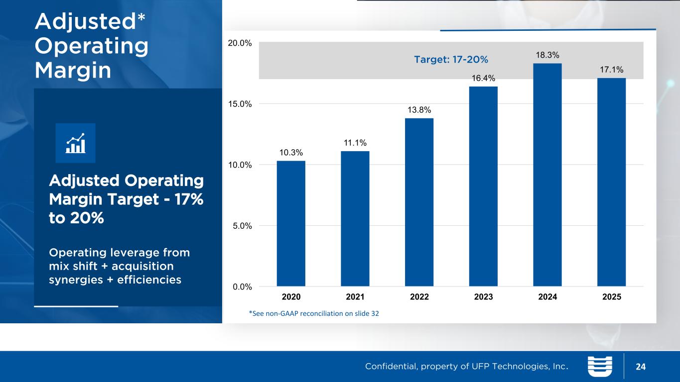 Gross Margin Target – 28% to 31% Operating Leverage from Mix Shift + Acquisition synergies + Efficiencies 23 Gross Profit Margin Target: 28-31% 2020 2021 2022 2023 2024 2025 18.0% 20.0% 22.0% 24.0% 26.0% 28.0% 30.0% 32.0% 24.9% 24.8% 25.5% 28.1% 29.1% 28.3% Confidential, property of UFP Technologies, Inc.