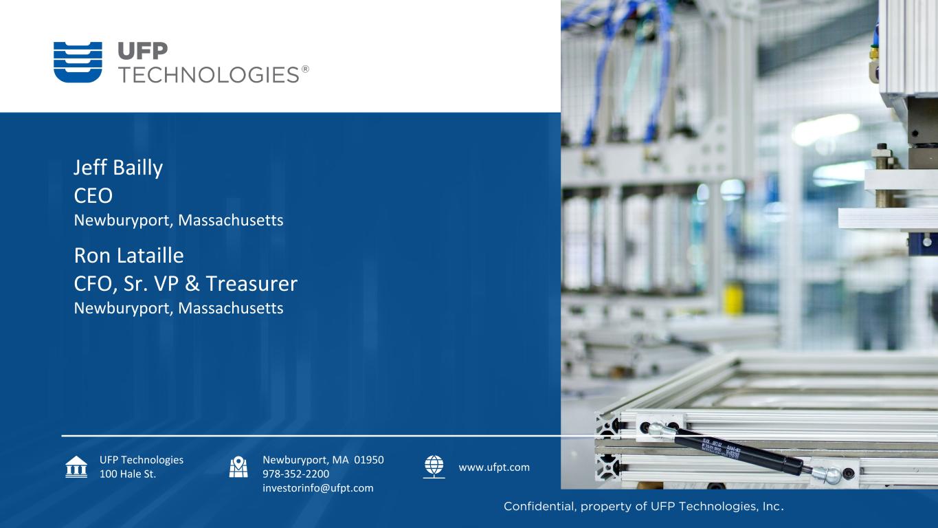 Ron Lataille CFO, Sr. VP & Treasurer Newburyport, Massachusetts UFP Technologies 100 Hale St. Newburyport, MA 01950 978-352-2200 investorinfo@ufpt.com www.ufpt.com Confidential, property of UFP Technologies, Inc. Jeff Bailly CEO Newburyport, Massachusetts