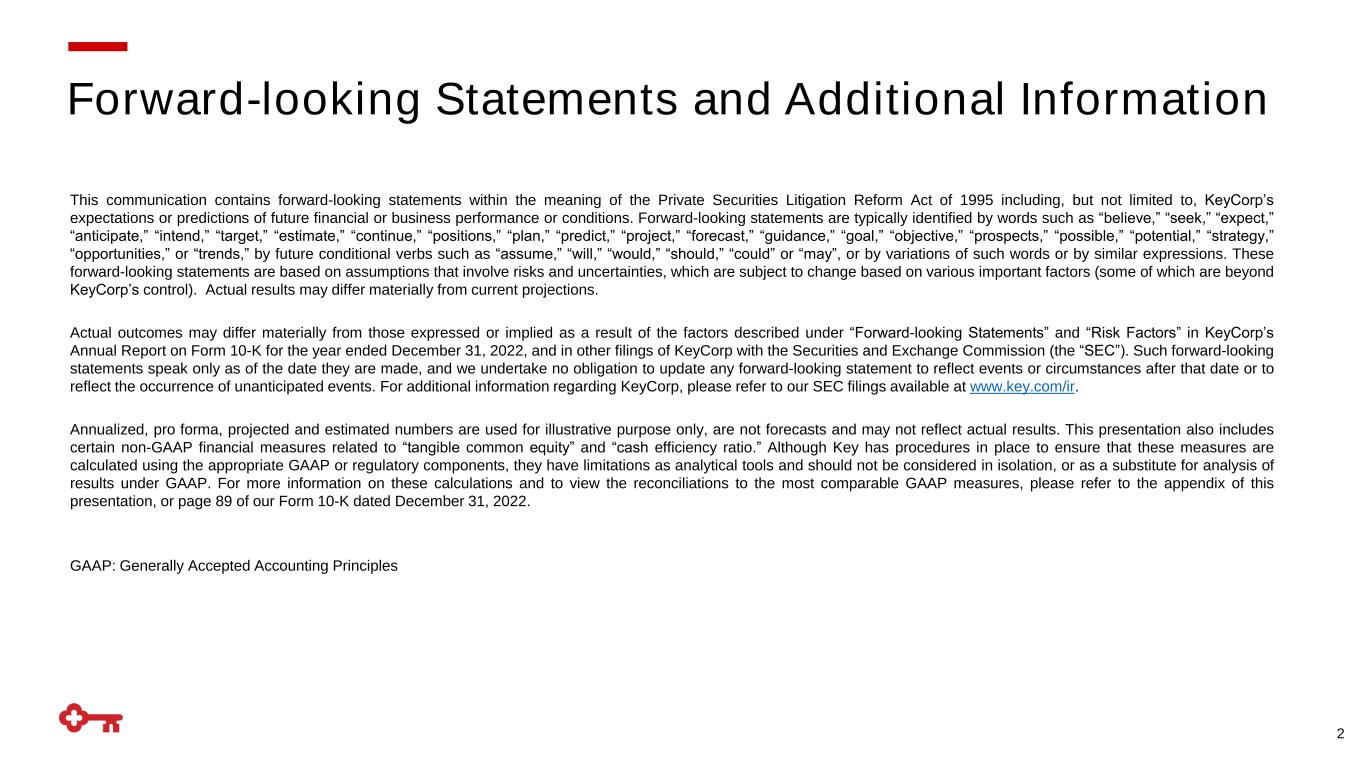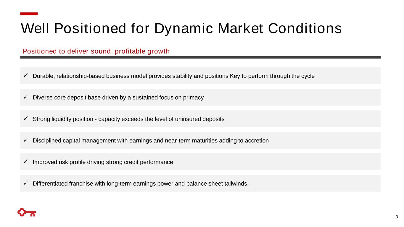 Forward-looking Statements and Additional Information This communication contains forward-looking statements within the meaning of the Private Securities Litigation Reform Act of 1995 including, but not limited to, KeyCorp’s expectations or predictions of future financial or business performance or conditions. Forward-looking statements are typically identified by words such as “believe,” “seek,” “expect,” “anticipate,” “intend,” “target,” “estimate,” “continue,” “positions,” “plan,” “predict,” “project,” “forecast,” “guidance,” “goal,” “objective,” “prospects,” “possible,” “potential,” “strategy,” “opportunities,” or “trends,” by future conditional verbs such as “assume,” “will,” “would,” “should,” “could” or “may”, or by variations of such words or by similar expressions. These forward-looking statements are based on assumptions that involve risks and uncertainties, which are subject to change based on various important factors (some of which are beyond KeyCorp’s control). Actual results may differ materially from current projections. Actual outcomes may differ materially from those expressed or implied as a result of the factors described under “Forward-looking Statements” and “Risk Factors” in KeyCorp’s Annual Report on Form 10-K for the year ended December 31, 2022, and in other filings of KeyCorp with the Securities and Exchange Commission (the “SEC”). Such forward-looking statements speak only as of the date they are made, and we undertake no obligation to update any forward-looking statement to reflect events or circumstances after that date or to reflect the occurrence of unanticipated events. For additional information regarding KeyCorp, please refer to our SEC filings available at www.key.com/ir. Annualized, pro forma, projected and estimated numbers are used for illustrative purpose only, are not forecasts and may not reflect actual results. This presentation also includes certain non-GAAP financial measures related to “tangible common equity” and “cash efficiency ratio.” Although Key has procedures in place to ensure that these measures are calculated using the appropriate GAAP or regulatory components, they have limitations as analytical tools and should not be considered in isolation, or as a substitute for analysis of results under GAAP. For more information on these calculations and to view the reconciliations to the most comparable GAAP measures, please refer to the appendix of this presentation, or page 89 of our Form 10-K dated December 31, 2022. GAAP: Generally Accepted Accounting Principles 2
