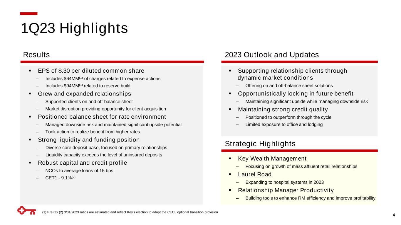 Well Positioned for Dynamic Market Conditions Positioned to deliver sound, profitable growth ✓ Durable, relationship-based business model provides stability and positions Key to perform through the cycle ✓ Diverse core deposit base driven by a sustained focus on primacy ✓ Strong liquidity position - capacity exceeds the level of uninsured deposits ✓ Disciplined capital management with earnings and near-term maturities adding to accretion ✓ Improved risk profile driving strong credit performance ✓ Differentiated franchise with long-term earnings power and balance sheet tailwinds 3