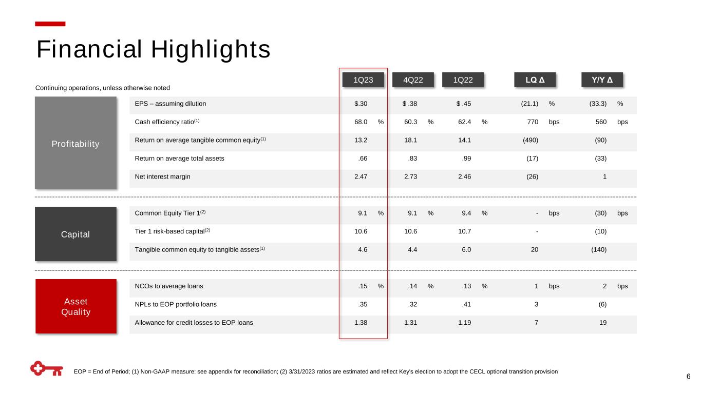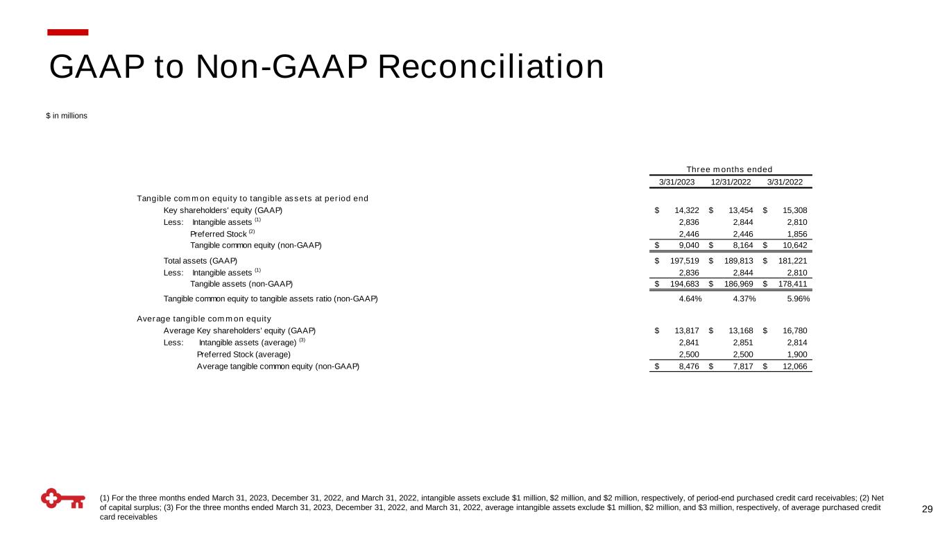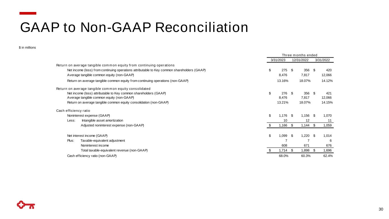 29 $ in millions (1) For the three months ended March 31, 2023, December 31, 2022, and March 31, 2022, intangible assets exclude $1 million, $2 million, and $2 million, respectively, of period-end purchased credit card receivables; (2) Net of capital surplus; (3) For the three months ended March 31, 2023, December 31, 2022, and March 31, 2022, average intangible assets exclude $1 million, $2 million, and $3 million, respectively, of average purchased credit card receivables GAAP to Non-GAAP Reconciliation 3/31/2023 12/31/2022 3/31/2022 Tangible common equity to tangible assets at period end Key shareholders' equity (GAAP) 14,322$ 13,454$ 15,308$ Less: Intangible assets (1) 2,836 2,844 2,810 Preferred Stock (2) 2,446 2,446 1,856 Tangible common equity (non-GAAP) 9,040$ 8,164$ 10,642$ Total assets (GAAP) 197,519$ 189,813$ 181,221$ Less: Intangible assets (1) 2,836 2,844 2,810 Tangible assets (non-GAAP) 194,683$ 186,969$ 178,411$ Tangible common equity to tangible assets ratio (non-GAAP) 4.64% 4.37% 5.96% Average tangible common equity Average Key shareholders' equity (GAAP) 13,817$ 13,168$ 16,780$ Less: Intangible assets (average) (3) 2,841 2,851 2,814 Preferred Stock (average) 2,500 2,500 1,900 Average tangible common equity (non-GAAP) 8,476$ 7,817$ 12,066$ Three months ended
