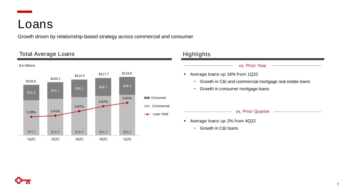 EOP = End of Period; (1) Non-GAAP measure: see appendix for reconciliation; (2) 3/31/2023 ratios are estimated and reflect Key's election to adopt the CECL optional transition provision 6 EPS – assuming dilution $.30 $ .38 $ .45 (21.1) % (33.3) % Cash efficiency ratio(1) 68.0 % 60.3 % 62.4 % 770 bps 560 bps Return on average tangible common equity(1) 13.2 18.1 14.1 (490) (90) Return on average total assets .66 .83 .99 (17) (33) Net interest margin 2.47 2.73 2.46 (26) 1 Common Equity Tier 1(2) 9.1 % 9.1 % 9.4 % - bps (30) bps Tier 1 risk-based capital(2) 10.6 10.6 10.7 - (10) Tangible common equity to tangible assets(1) 4.6 4.4 6.0 20 (140) NCOs to average loans .15 % .14 % .13 % 1 bps 2 bps NPLs to EOP portfolio loans .35 .32 .41 3 (6) Allowance for credit losses to EOP loans 1.38 1.31 1.19 7 19 Profitability Capital Asset Quality 1Q23 4Q22 1Q22 LQ Δ Y/Y Δ Continuing operations, unless otherwise noted Financial Highlights
