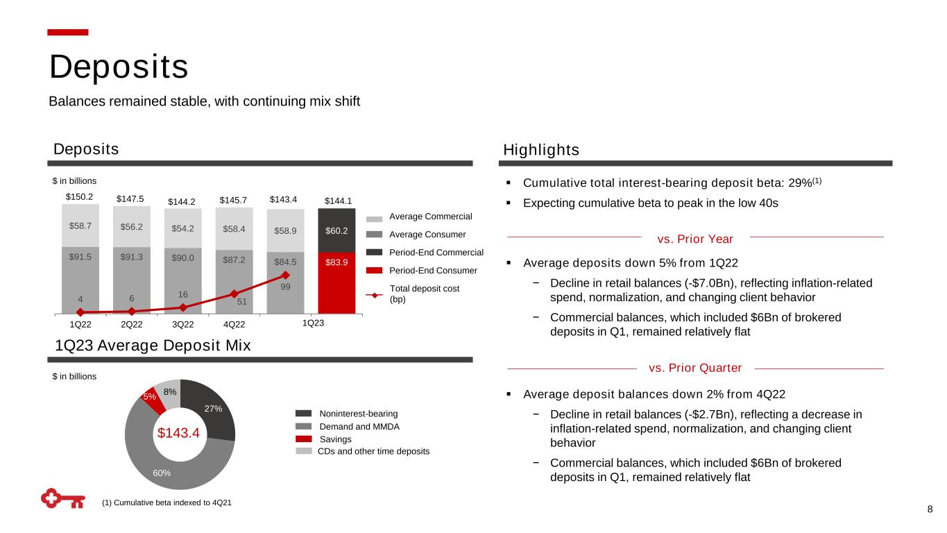 Total Average Loans Highlights 7 $72.1 $75.0 $78.4 $81.0 $83.1 $31.6 $34.1 $36.1 $36.7 $36.8 3.28% 3.41% 3.97% 4.57% 5.01% 1.00% 1Q22 2Q22 3Q22 4Q22 1Q23 Loan Yield Consumer Commercial $ in billions ▪ Average loans up 16% from 1Q22 − Growth in C&I and commercial mortgage real estate loans − Growth in consumer mortgage loans ▪ Average loans up 2% from 4Q22 − Growth in C&I loans vs. Prior Year vs. Prior Quarter $103.8 $109.1 $114.4 $117.7 $119.8 Loans Growth driven by relationship-based strategy across commercial and consumer