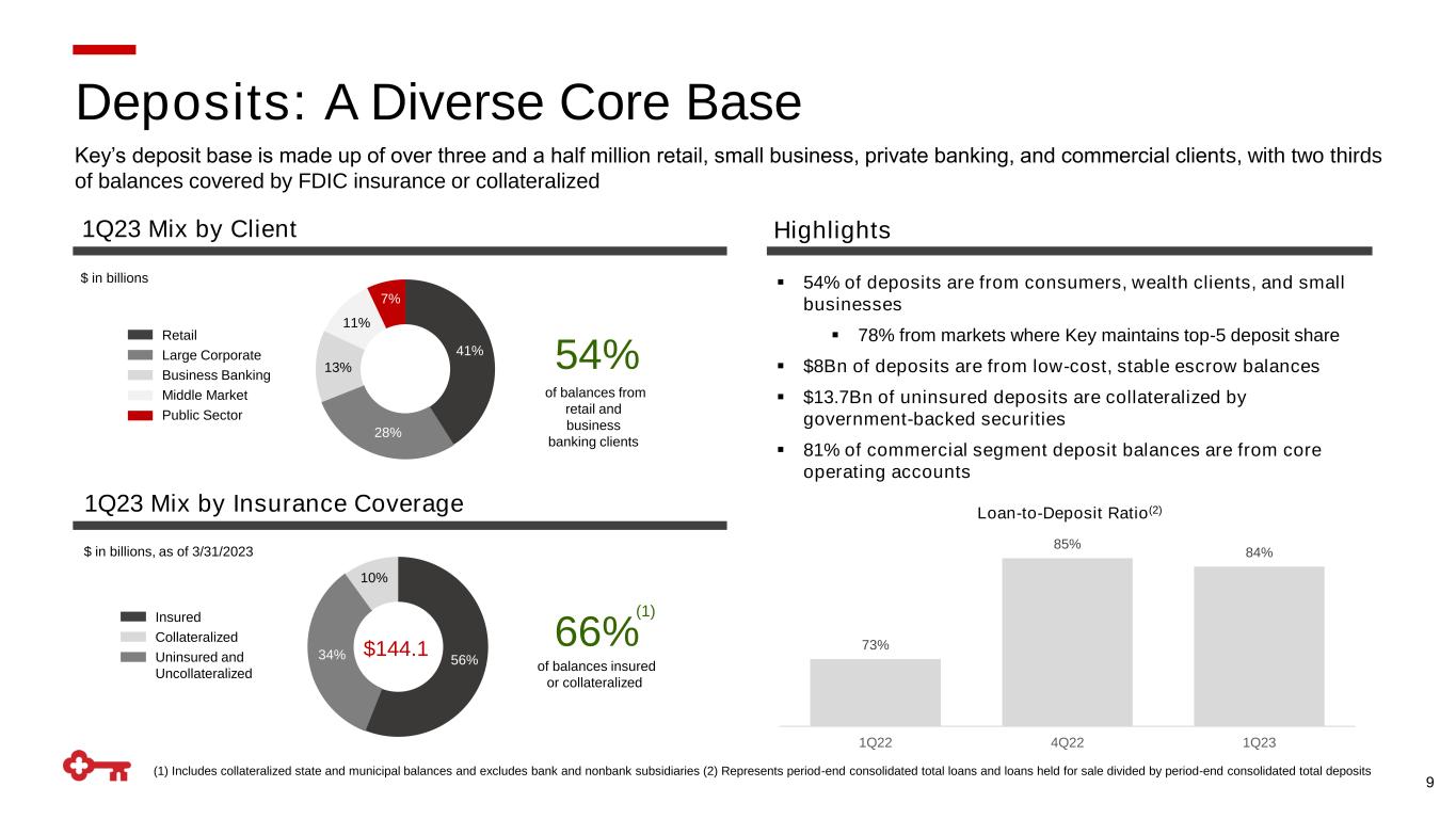 (1) Cumulative beta indexed to 4Q21 8 $ in billions CDs and other time deposits Savings Noninterest-bearing Demand and MMDA $ in billions 1Q23 Average Deposit Mix 60% 27% 8% 5% Average Consumer Average Commercial $150.2 $143.4 $143.4 Total deposit cost (bp) $147.5 $144.2 $145.7 Deposits Balances remained stable, with continuing mix shift Deposits Highlights ▪ Average deposits down 5% from 1Q22 − Decline in retail balances (-$7.0Bn), reflecting inflation-related spend, normalization, and changing client behavior − Commercial balances, which included $6Bn of brokered deposits in Q1, remained relatively flat ▪ Average deposit balances down 2% from 4Q22 − Decline in retail balances (-$2.7Bn), reflecting a decrease in inflation-related spend, normalization, and changing client behavior − Commercial balances, which included $6Bn of brokered deposits in Q1, remained relatively flat vs. Prior Year vs. Prior Quarter Period-End Consumer Period-End Commercial $144.1 ▪ Cumulative total interest-bearing deposit beta: 29%(1) ▪ Expecting cumulative beta to peak in the low 40s $91.5 $91.3 $90.0 $87.2 $84.5 $83.9 $58.7 $56.2 $54.2 $58.4 $58.9 $60.2 4 6 16 51 99 1Q22 2Q22 3Q22 4Q22 1Q23