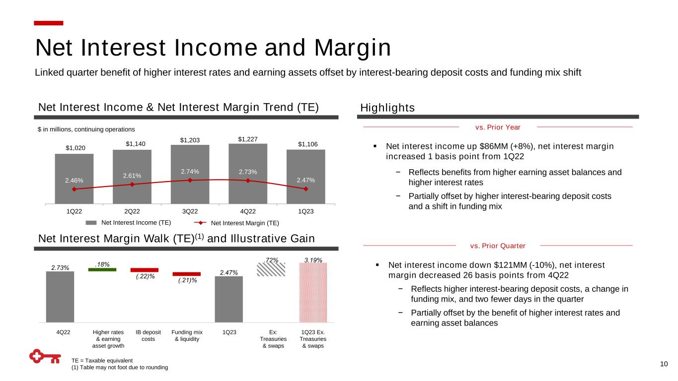 73% 85% 84% 1Q22 4Q22 1Q23 9 $ in billions, as of 3/31/2023 ▪ 54% of deposits are from consumers, wealth clients, and small businesses ▪ 78% from markets where Key maintains top-5 deposit share ▪ $8Bn of deposits are from low-cost, stable escrow balances ▪ $13.7Bn of uninsured deposits are collateralized by government-backed securities ▪ 81% of commercial segment deposit balances are from core operating accounts 1Q23 Mix by Insurance Coverage 59% 32% 5% Deposits: A Diverse Core Base Key’s deposit base is made up of over three and a half million retail, small business, private banking, and commercial clients, with two thirds of balances covered by FDIC insurance or collateralized 1Q23 Mix by Client Highlights 41% 28% 13% 11% 7% Middle Market Business Banking Retail Large Corporate Public Sector Uninsured and Uncollateralized Insured Collateralized 56%34% 10% $144.1 $ in billions 66% of balances insured or collateralized 54% of balances from retail and business banking clients Loan-to-Deposit Ratio(2) (1) Includes collateralized state and municipal balances and excludes bank and nonbank subsidiaries (2) Represents period-end consolidated total loans and loans held for sale divided by period-end consolidated total deposits (1)