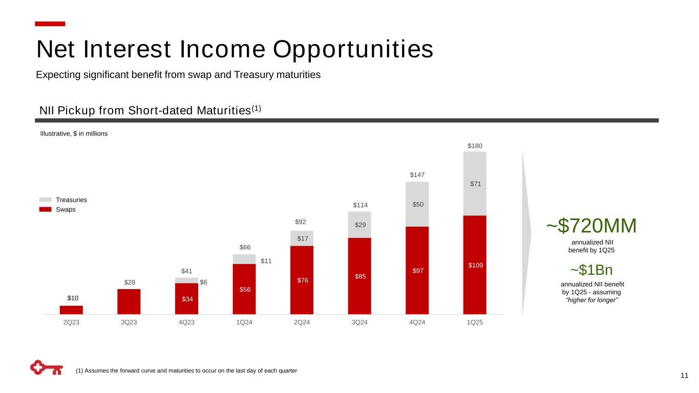 $ in millions, continuing operations vs. Prior Quarter TE = Taxable equivalent (1) Table may not foot due to rounding $1,020 $1,140 $1,203 $1,227 $1,106 2.46% 2.61% 2.74% 2.73% 2.47% 1Q22 2Q22 3Q22 4Q22 1Q23 ▪ Net interest income up $86MM (+8%), net interest margin increased 1 basis point from 1Q22 − Reflects benefits from higher earning asset balances and higher interest rates − Partially offset by higher interest-bearing deposit costs and a shift in funding mix ▪ Net interest income down $121MM (-10%), net interest margin decreased 26 basis points from 4Q22 − Reflects higher interest-bearing deposit costs, a change in funding mix, and two fewer days in the quarter − Partially offset by the benefit of higher interest rates and earning asset balances 10 vs. Prior Year Net Interest Income (TE) Net Interest Margin (TE) Linked quarter benefit of higher interest rates and earning assets offset by interest-bearing deposit costs and funding mix shift Net Interest Income and Margin Net Interest Income & Net Interest Margin Trend (TE) Highlights Net Interest Margin Walk (TE)(1) and Illustrative Gain Higher rates & earning asset growth IB deposit costs Funding mix & liquidity 1Q234Q22 Ex: Treasuries & swaps 1Q23 Ex. Treasuries & swaps
