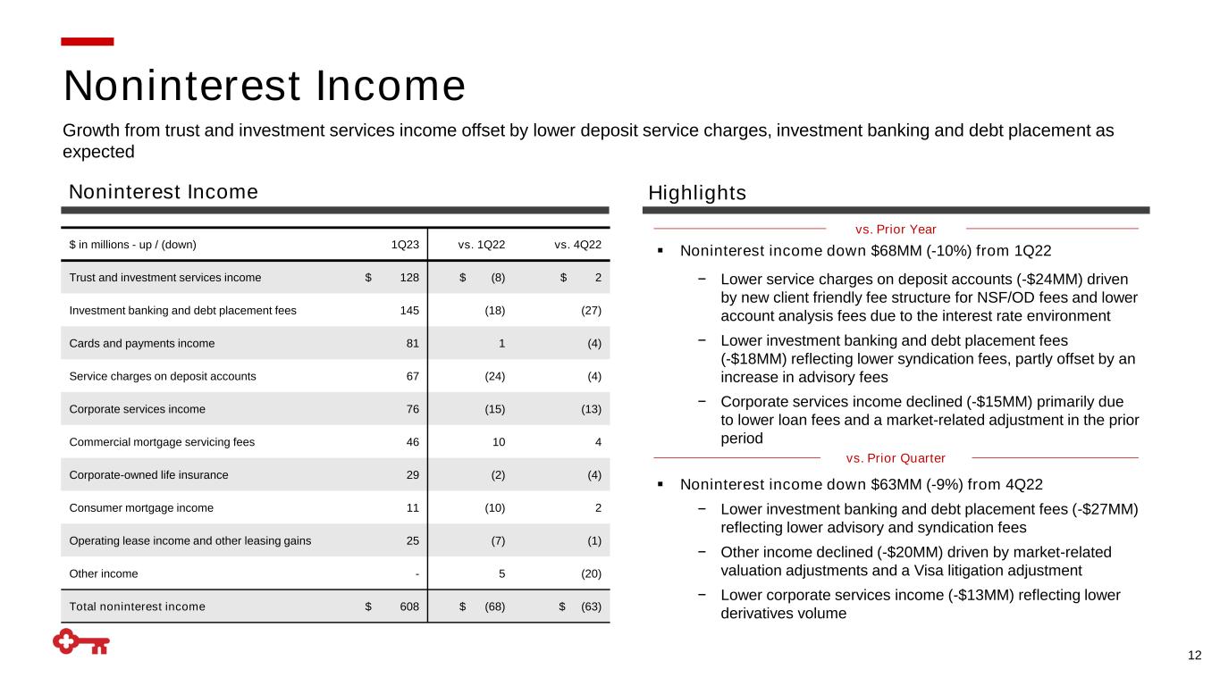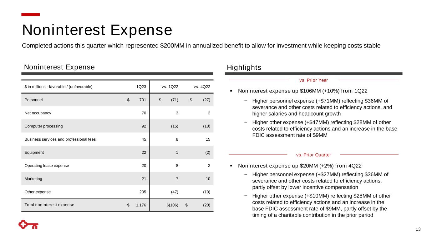 12 ▪ Noninterest income down $68MM (-10%) from 1Q22 − Lower service charges on deposit accounts (-$24MM) driven by new client friendly fee structure for NSF/OD fees and lower account analysis fees due to the interest rate environment − Lower investment banking and debt placement fees (-$18MM) reflecting lower syndication fees, partly offset by an increase in advisory fees − Corporate services income declined (-$15MM) primarily due to lower loan fees and a market-related adjustment in the prior period vs. Prior Quarter ▪ Noninterest income down $63MM (-9%) from 4Q22 − Lower investment banking and debt placement fees (-$27MM) reflecting lower advisory and syndication fees − Other income declined (-$20MM) driven by market-related valuation adjustments and a Visa litigation adjustment − Lower corporate services income (-$13MM) reflecting lower derivatives volume vs. Prior Year $ in millions - up / (down) 1Q23 vs. 1Q22 vs. 4Q22 Trust and investment services income $ 128 $ (8) $ 2 Investment banking and debt placement fees 145 (18) (27) Cards and payments income 81 1 (4) Service charges on deposit accounts 67 (24) (4) Corporate services income 76 (15) (13) Commercial mortgage servicing fees 46 10 4 Corporate-owned life insurance 29 (2) (4) Consumer mortgage income 11 (10) 2 Operating lease income and other leasing gains 25 (7) (1) Other income - 5 (20) Total noninterest income $ 608 $ (68) $ (63) Growth from trust and investment services income offset by lower deposit service charges, investment banking and debt placement as expected Noninterest Income Noninterest Income Highlights