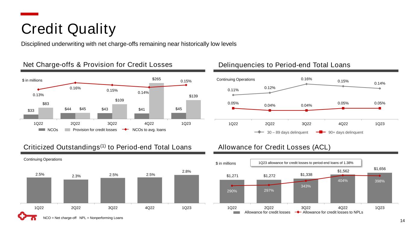 13 vs. Prior Quarter vs. Prior Year ▪ Noninterest expense up $106MM (+10%) from 1Q22 − Higher personnel expense (+$71MM) reflecting $36MM of severance and other costs related to efficiency actions, and higher salaries and headcount growth − Higher other expense (+$47MM) reflecting $28MM of other costs related to efficiency actions and an increase in the base FDIC assessment rate of $9MM ▪ Noninterest expense up $20MM (+2%) from 4Q22 − Higher personnel expense (+$27MM) reflecting $36MM of severance and other costs related to efficiency actions, partly offset by lower incentive compensation − Higher other expense (+$10MM) reflecting $28MM of other costs related to efficiency actions and an increase in the base FDIC assessment rate of $9MM, partly offset by the timing of a charitable contribution in the prior period Completed actions this quarter which represented $200MM in annualized benefit to allow for investment while keeping costs stable Noninterest Expense Noninterest Expense Highlights $ in millions - favorable / (unfavorable) 1Q23 vs. 1Q22 vs. 4Q22 Personnel $ 701 $ (71) $ (27) Net occupancy 70 3 2 Computer processing 92 (15) (10) Business services and professional fees 45 8 15 Equipment 22 1 (2) Operating lease expense 20 8 2 Marketing 21 7 10 Other expense 205 (47) (10) Total noninterest expense $ 1,176 $(106) $ (20)