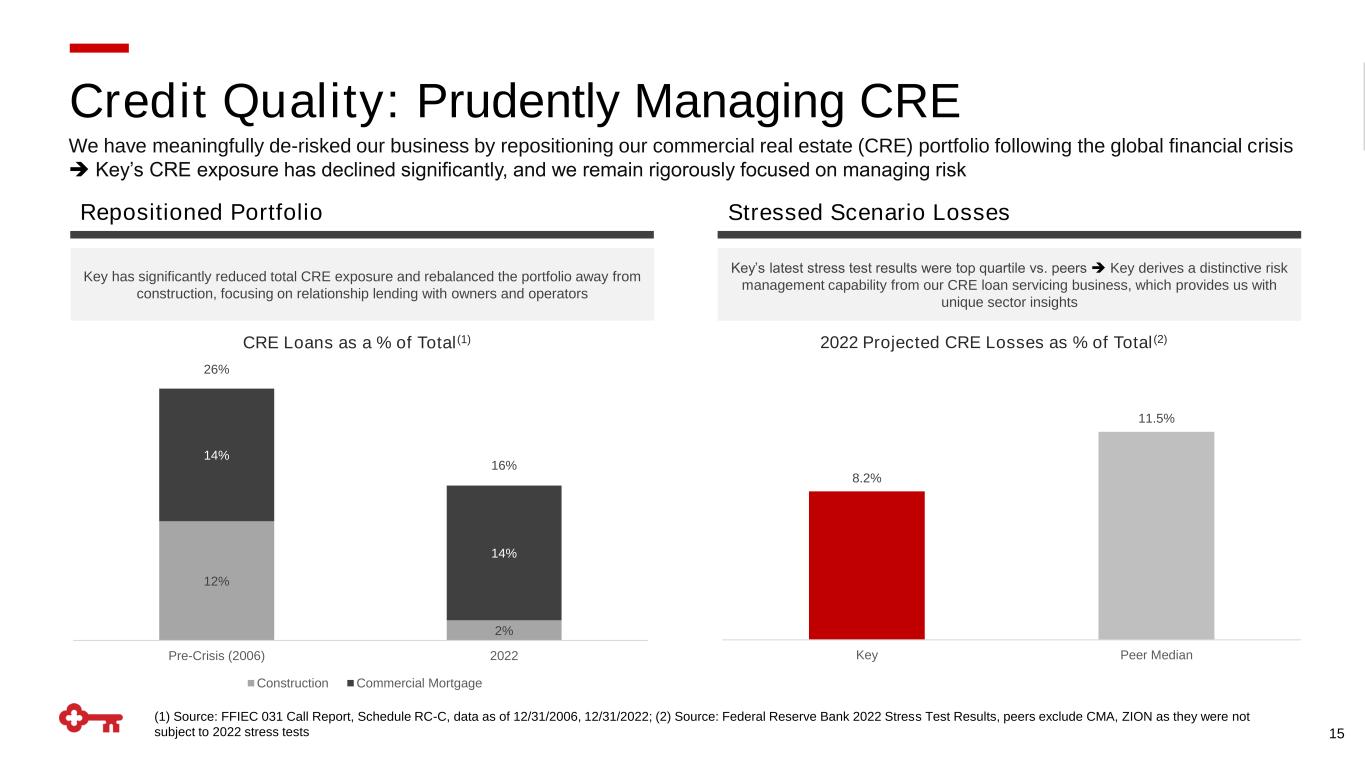 12% 2% 14% 14% 26% 16% Pre-Crisis (2006) 2022 Construction Commercial Mortgage Credit Quality: Prudently Managing CRE We have meaningfully de-risked our business by repositioning our commercial real estate (CRE) portfolio following the global financial crisis ➔ Key’s CRE exposure has declined significantly, and we remain rigorously focused on managing risk (1) Source: FFIEC 031 Call Report, Schedule RC-C, data as of 12/31/2006, 12/31/2022; (2) Source: Federal Reserve Bank 2022 Stress Test Results, peers exclude CMA, ZION as they were not subject to 2022 stress tests Repositioned Portfolio Stressed Scenario Losses Key has significantly reduced total CRE exposure and rebalanced the portfolio away from construction, focusing on relationship lending with owners and operators Key’s latest stress test results were top quartile vs. peers ➔ Key derives a distinctive risk management capability from our CRE loan servicing business, which provides us with unique sector insights 8.2% 11.5% Key Peer Median 2022 Projected CRE Losses as % of Total(2)CRE Loans as a % of Total(1) 15