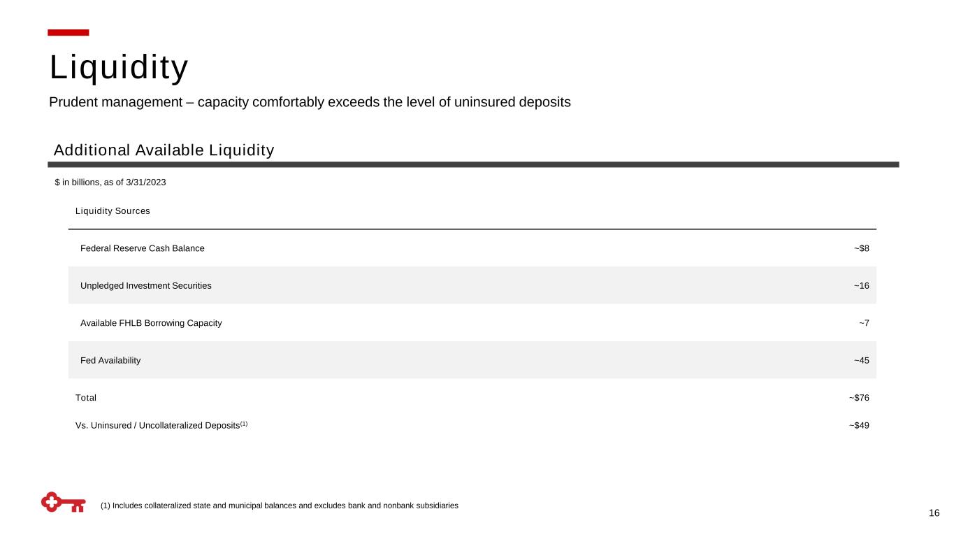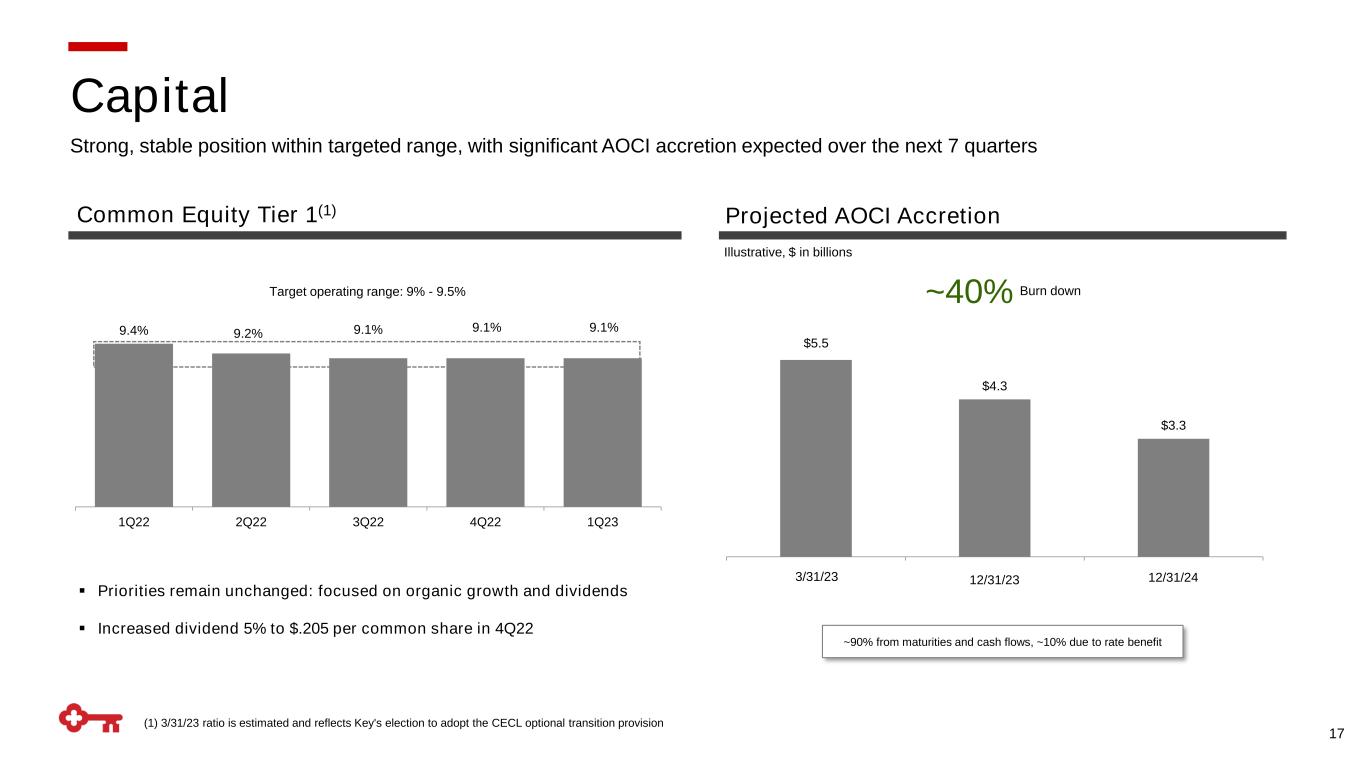 16 Prudent management – capacity comfortably exceeds the level of uninsured deposits Liquidity Additional Available Liquidity $ in billions, as of 3/31/2023 Liquidity Sources Federal Reserve Cash Balance ~$8 Unpledged Investment Securities ~16 Available FHLB Borrowing Capacity ~7 Fed Availability ~45 Total ~$76 Vs. Uninsured / Uncollateralized Deposits(1) ~$49 (1) Includes collateralized state and municipal balances and excludes bank and nonbank subsidiaries