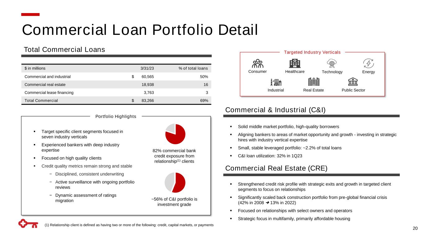 Full Year 2023 (vs. Full Year 2022) 18 Average Balance Sheet • Loans: up 6% - 9% • Deposits: flat to down 2% Net Interest Income (TE) • Net interest income: down 1% - 3% (previously up 1% - 4%) Noninterest Income • Noninterest income: down 1% - 3% Noninterest Expense • Noninterest expense: relatively stable – including $64MM of charges in 1Q23 related to expense actions Credit Quality • Net charge-offs to average loans: 25 – 30 bps Taxes • GAAP tax rate: 20% - 21% (previously 19% - 20%) Long-term Targets Positive operating leverage Moderate risk profile: Net charge-offs to avg. loans targeted range of 40-60 bps ROTCE: 16% - 19% Cash efficiency ratio: 54% - 56% Note: Guidance range: relatively stable: +/- 2% 2023 Outlook Updated Guidance (as of 4/20/2023) ➔ Changes reflected in red