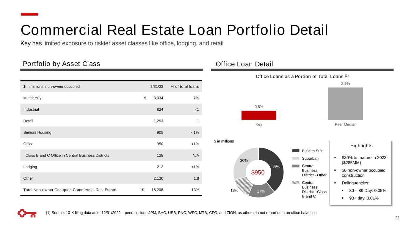 Portfolio Highlights ▪ Target specific client segments focused in seven industry verticals ▪ Experienced bankers with deep industry expertise ▪ Focused on high quality clients ▪ Credit quality metrics remain strong and stable − Disciplined, consistent underwriting − Active surveillance with ongoing portfolio reviews − Dynamic assessment of ratings migration 82% commercial bank credit exposure from relationship(1) clients Targeted Industry Verticals Consumer Energy Industrial TechnologyHealthcare (1) Relationship client is defined as having two or more of the following: credit, capital markets, or payments ▪ Solid middle market portfolio, high-quality borrowers ▪ Aligning bankers to areas of market opportunity and growth - investing in strategic hires with industry vertical expertise ▪ Small, stable leveraged portfolio: ~2.2% of total loans ▪ C&I loan utilization: 32% in 1Q23 ▪ Strengthened credit risk profile with strategic exits and growth in targeted client segments to focus on relationships ▪ Significantly scaled back construction portfolio from pre-global financial crisis (42% in 2008  13% in 2022) ▪ Focused on relationships with select owners and operators ▪ Strategic focus in multifamily, primarily affordable housing Real Estate Public Sector Commercial Real Estate (CRE) 20 $ in millions 3/31/23 % of total loans Commercial and industrial $ 60,565 50% Commercial real estate 18,938 16 Commercial lease financing 3,763 3 Total Commercial $ 83,266 69% ~56% of C&I portfolio is investment grade Commercial Loan Portfolio Detail Total Commercial Loans Commercial & Industrial (C&I)