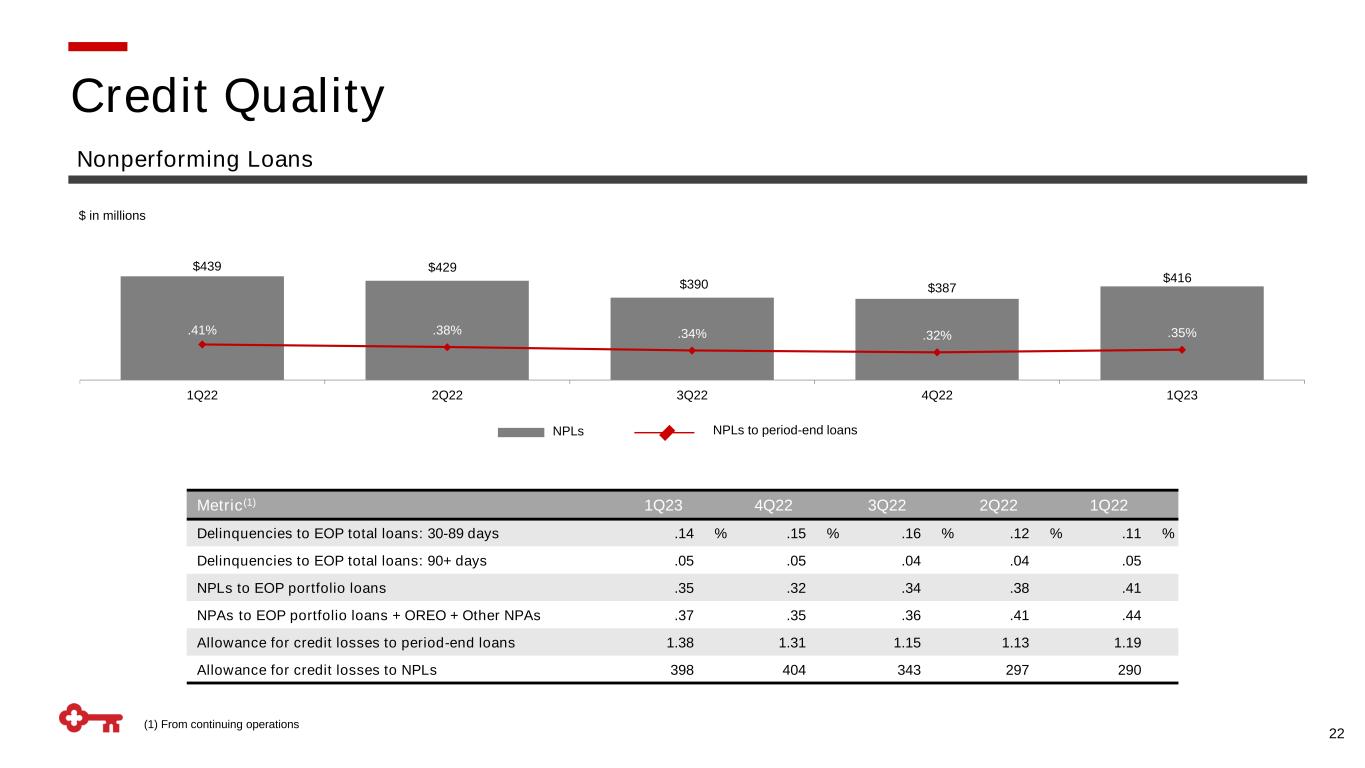 (1) From continuing operations 22 Metric(1) 1Q23 4Q22 3Q22 2Q22 1Q22 Delinquencies to EOP total loans: 30-89 days .14 % .15 % .16 % .12 % .11 % Delinquencies to EOP total loans: 90+ days .05 .05 .04 .04 .05 NPLs to EOP portfolio loans .35 .32 .34 .38 .41 NPAs to EOP portfolio loans + OREO + Other NPAs .37 .35 .36 .41 .44 Allowance for credit losses to period-end loans 1.38 1.31 1.15 1.13 1.19 Allowance for credit losses to NPLs 398 404 343 297 290 Credit Quality Nonperforming Loans $439 $429 $390 $387 $416 .41% .38% .34% .32% .35% 1Q22 2Q22 3Q22 4Q22 1Q23 NPLs NPLs to period-end loans $ in millions