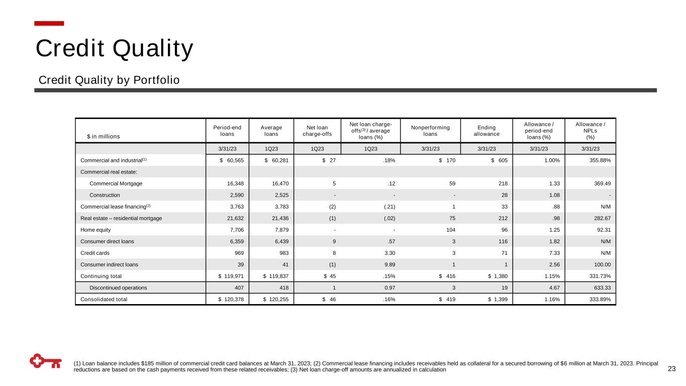 23 Period-end loans Average loans Net loan charge-offs Net loan charge- offs(3) / average loans (%) Nonperforming loans Ending allowance Allowance / period-end loans (%) Allowance / NPLs (%) 3/31/23 1Q23 1Q23 1Q23 3/31/23 3/31/23 3/31/23 3/31/23 Commercial and industrial(1) $ 60,565 $ 60,281 $ 27 .18% $ 170 $ 605 1.00% 355.88% Commercial real estate: Commercial Mortgage 16,348 16,470 5 .12 59 218 1.33 369.49 Construction 2,590 2,525 - - - 28 1.08 - Commercial lease financing(2) 3,763 3,783 (2) (.21) 1 33 .88 N/M Real estate – residential mortgage 21,632 21,436 (1) (.02) 75 212 .98 282.67 Home equity 7,706 7,879 - - 104 96 1.25 92.31 Consumer direct loans 6,359 6,439 9 .57 3 116 1.82 N/M Credit cards 969 983 8 3.30 3 71 7.33 N/M Consumer indirect loans 39 41 (1) 9.89 1 1 2.56 100.00 Continuing total $ 119,971 $ 119,837 $ 45 .15% $ 416 $ 1,380 1.15% 331.73% Discontinued operations 407 418 1 0.97 3 19 4.67 633.33 Consolidated total $ 120,378 $ 120,255 $ 46 .16% $ 419 $ 1,399 1.16% 333.89% $ in millions (1) Loan balance includes $185 million of commercial credit card balances at March 31, 2023; (2) Commercial lease financing includes receivables held as collateral for a secured borrowing of $6 million at March 31, 2023. Principal reductions are based on the cash payments received from these related receivables; (3) Net loan charge-off amounts are annualized in calculation Credit Quality Credit Quality by Portfolio