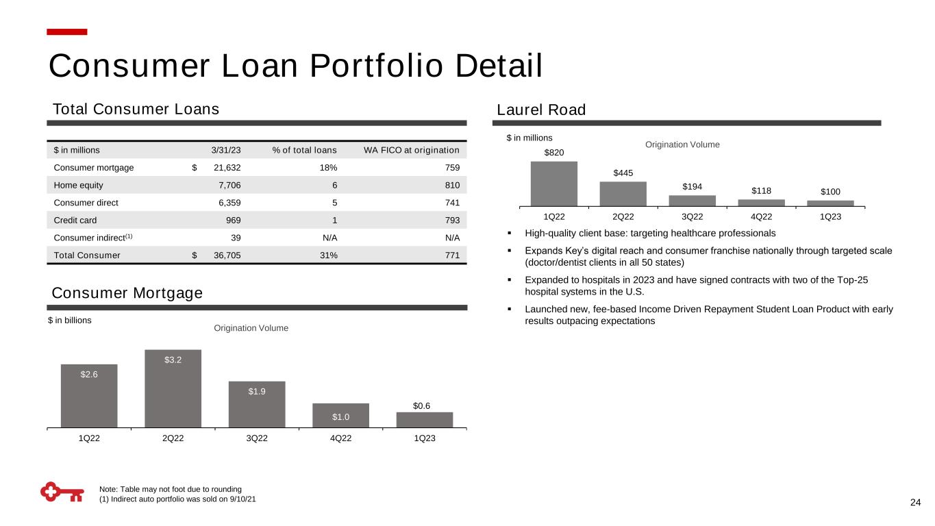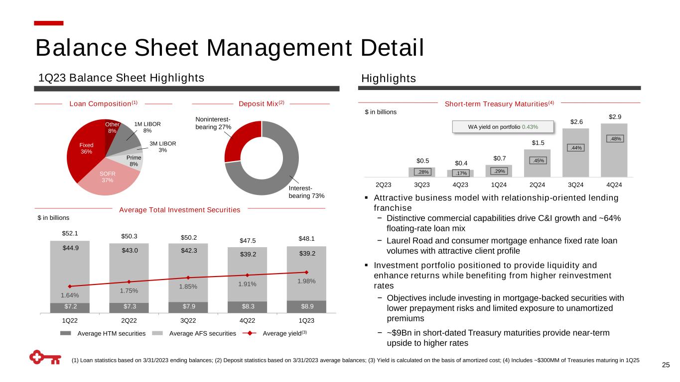 $2.6 $3.2 $1.9 $1.0 $0.6 1Q22 2Q22 3Q22 4Q22 1Q23 Origination Volume $820 $445 $194 $118 $100 1Q22 2Q22 3Q22 4Q22 1Q23 Origination Volume $ in millions $ in billions Note: Table may not foot due to rounding (1) Indirect auto portfolio was sold on 9/10/21 ▪ High-quality client base: targeting healthcare professionals ▪ Expands Key’s digital reach and consumer franchise nationally through targeted scale (doctor/dentist clients in all 50 states) ▪ Expanded to hospitals in 2023 and have signed contracts with two of the Top-25 hospital systems in the U.S. ▪ Launched new, fee-based Income Driven Repayment Student Loan Product with early results outpacing expectations 24 $ in millions 3/31/23 % of total loans WA FICO at origination Consumer mortgage $ 21,632 18% 759 Home equity 7,706 6 810 Consumer direct 6,359 5 741 Credit card 969 1 793 Consumer indirect(1) 39 N/A N/A Total Consumer $ 36,705 31% 771 Consumer Loan Portfolio Detail Consumer Mortgage Total Consumer Loans Laurel Road