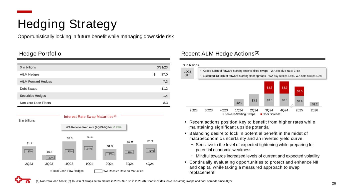 $0.5 $0.4 $0.7 $1.5 $2.6 $2.9 $0.0 $0.5 $1.0 $1.5 $2.0 $2.5 $3.0 $3.5 2Q23 3Q23 4Q23 1Q24 2Q24 3Q24 4Q24 (1) Loan statistics based on 3/31/2023 ending balances; (2) Deposit statistics based on 3/31/2023 average balances; (3) Yield is calculated on the basis of amortized cost; (4) Includes ~$300MM of Treasuries maturing in 1Q25 Loan Composition(1) Deposit Mix(2) ▪ Attractive business model with relationship-oriented lending franchise − Distinctive commercial capabilities drive C&I growth and ~64% floating-rate loan mix − Laurel Road and consumer mortgage enhance fixed rate loan volumes with attractive client profile ▪ Investment portfolio positioned to provide liquidity and enhance returns while benefiting from higher reinvestment rates − Objectives include investing in mortgage-backed securities with lower prepayment risks and limited exposure to unamortized premiums − ~$9Bn in short-dated Treasury maturities provide near-term upside to higher rates 25 Noninterest- bearing 27% Interest- bearing 73% WA yield on portfolio 0.43% $7.2 $7.3 $7.9 $8.3 $8.9 $44.9 $43.0 $42.3 $39.2 $39.2 1.64% 1.75% 1.85% 1.91% 1.98% 1Q22 2Q22 3Q22 4Q22 1Q23 Average AFS securities Average yield(3)Average HTM securities $ in billions Average Total Investment Securities Balance Sheet Management Detail 1Q23 Balance Sheet Highlights Highlights $ in billions .48% .44% .45% .29%.17%.28% $52.1 $50.3 $50.2 $47.5 Short-term Treasury Maturities(4) $48.1 Prime 8% 1M LIBOR 8% 3M LIBOR 3% Other 8% SOFR 37% Fixed 36%