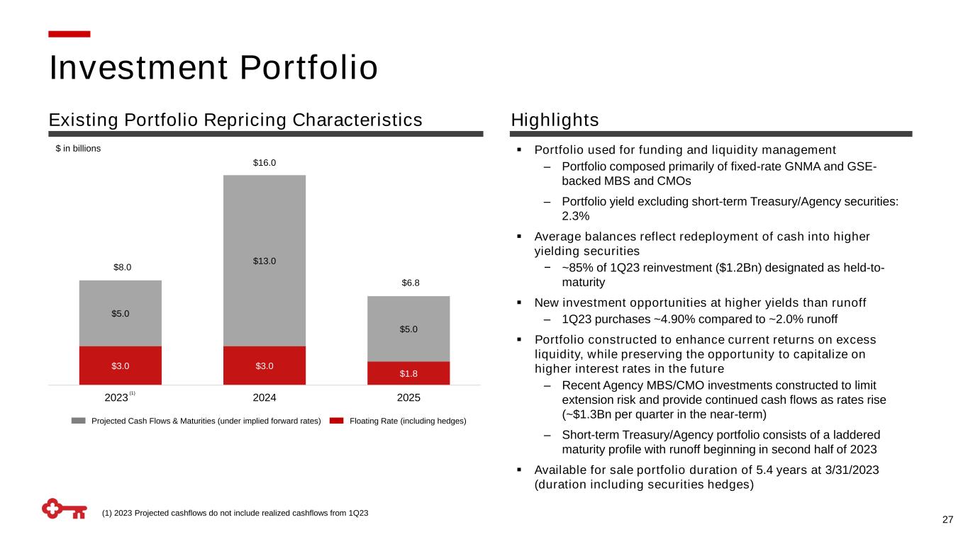 (1) Non-zero loan floors; (2) $5.2Bn of swaps set to mature in 2025; $9.1Bn in 2026 (3) Chart includes forward-starting swaps and floor spreads since 4Q22 ▪ Recent actions position Key to benefit from higher rates while maintaining significant upside potential ▪ Balancing desire to lock in potential benefit in the midst of macroeconomic uncertainty and an inverted yield curve − Sensitive to the level of expected tightening while preparing for potential economic weakness − Mindful towards increased levels of current and expected volatility ▪ Continually evaluating opportunities to protect and enhance NII and capital while taking a measured approach to swap replacement 26 WA Receive fixed rate (2Q23-4Q24): 0.45% Hedging Strategy Opportunistically locking in future benefit while managing downside risk Hedge Portfolio Recent ALM Hedge Actions(3) $1.7 $0.6 $2.3 $2.4 $1.3 $1.9 $1.9 $0.0 $1.0 $2.0 $3.0 2Q23 3Q23 4Q23 1Q24 2Q24 3Q24 4Q24 Total Cash Flow Hedges WA Receive Rate on Maturities .37% .27% .41% .34% .65% .57% .53% $2.0 $3.3 $3.5 $3.5 $2.9 $1.2 $3.3 $3.3 $2.5 ($1.0) $1.0 $3.0 $5.0 $7.0 2Q23 3Q23 4Q23 1Q24 2Q24 3Q24 4Q24 2025 2026 Forward-Starting Swaps Floor Spreads • Added $3Bn of forward-starting receive fixed swaps - WA receive rate: 3.4% • Executed $3.3Bn of forward-starting floor spreads - WA buy strike: 3.4%, WA sold strike: 2.3% 1Q23 QTD Interest Rate Swap Maturities(2) $ in billions $ in billions $ in billions 3/31/23 A/LM Hedges $ 27.0 A/LM Forward Hedges 7.3 Debt Swaps 11.2 Securities Hedges 1.4 Non-zero Loan Floors 8.3