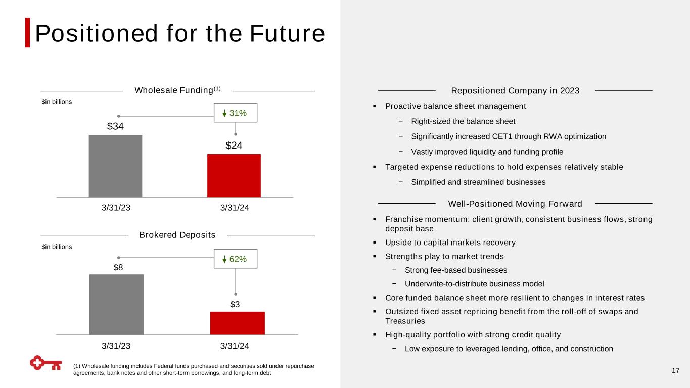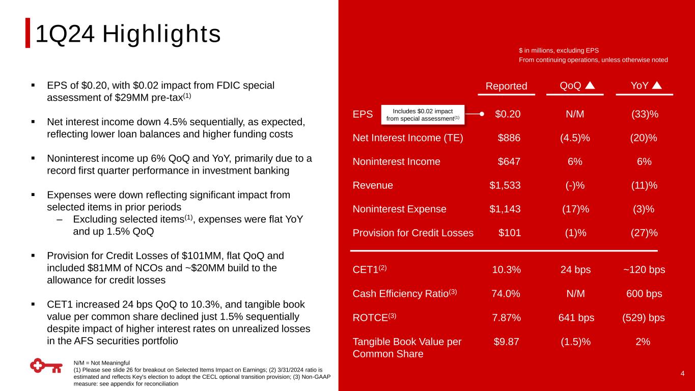 2 Note: All metrics are as of 3/31/2024 unless otherwise noted (1) 3/31/2024 ratio is estimated and reflects Key's election to adopt the CECL optional transition provision ✓Enhanced underwrite-to- distribute platform through partnership with Blackstone+6% YoY Commercial Client Growth Differentiated Fee Businesses Focused on Targeted Scale Driving New Relationships Focused on Primacy 10.3% Common Equity Tier 1(1) +6% YoY Increase in noninterest income, driven by record 1Q Investment Banking fees Strengthening the Balance Sheet Reduced reliance on wholesale funding and higher-cost brokered deposits 29bps NCOs / Average Loans Risk Management Excellence Expanded underwrite-to-distribute model by formulating a new strategic partnership +2.5% YoY Net New Relationship Household Growth 1Q24 Results 60bps NPAs / Period-end Loans