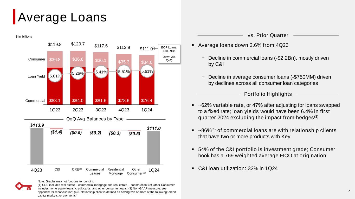 4 Reported QoQ▪ EPS of $0.20, with $0.02 impact from FDIC special assessment of $29MM pre-tax(1) ▪ Net interest income down 4.5% sequentially, as expected, reflecting lower loan balances and higher funding costs ▪ Noninterest income up 6% QoQ and YoY, primarily due to a record first quarter performance in investment banking ▪ Expenses were down reflecting significant impact from selected items in prior periods ‒ Excluding selected items(1), expenses were flat YoY and up 1.5% QoQ ▪ Provision for Credit Losses of $101MM, flat QoQ and included $81MM of NCOs and ~$20MM build to the allowance for credit losses ▪ CET1 increased 24 bps QoQ to 10.3%, and tangible book value per common share declined just 1.5% sequentially despite impact of higher interest rates on unrealized losses in the AFS securities portfolio YoY EPS $0.20 N/M (33)% Net Interest Income (TE) $886 (4.5)% (20)% Noninterest Income $647 6% 6% Revenue $1,533 (-)% (11)% Noninterest Expense $1,143 (17)% (3)% Provision for Credit Losses $101 (1)% (27)% CET1(2) 10.3% 24 bps ~120 bps $ in millions, excluding EPS From continuing operations, unless otherwise noted N/M = Not Meaningful (1) Please see slide 26 for breakout on Selected Items Impact on Earnings; (2) 3/31/2024 ratio is estimated and reflects Key's election to adopt the CECL optional transition provision; (3) Non-GAAP measure: see appendix for reconciliation Tangible Book Value per Common Share $9.87 (1.5)% 2% Cash Efficiency Ratio(3) 74.0% N/M 600 bps ROTCE(3) 7.87% 641 bps (529) bps Includes $0.02 impact from special assessment(1) 1Q24 Highlights