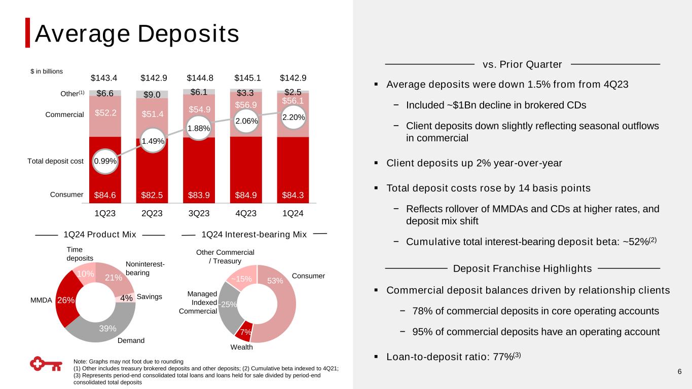 $83.1 $84.0 $81.6 $78.6 $76.4 $36.8 $36.6 $36.1 $35.3 $34.6 1.00% 1Q23 2Q23 3Q23 4Q23 1Q24 5 ▪ Average loans down 2.6% from 4Q23 − Decline in commercial loans (-$2.2Bn), mostly driven by C&I − Decline in average consumer loans (-$750MM) driven by declines across all consumer loan categories vs. Prior Quarter Portfolio Highlights Consumer Commercial Loan Yield $119.8 $120.7 $117.6 $113.9 $111.0 $ in billions ▪ ~62% variable rate, or 47% after adjusting for loans swapped to a fixed rate; loan yields would have been 6.4% in first quarter 2024 excluding the impact from hedges(3) ▪ ~86%(4) of commercial loans are with relationship clients that have two or more products with Key ▪ 54% of the C&I portfolio is investment grade; Consumer book has a 769 weighted average FICO at origination ▪ C&I loan utilization: 32% in 1Q24 QoQ Avg Balances by Type 5.01% 5.26% 5.41% 5.51% 5.61% EOP Loans: $109.9Bn Down 2% QoQ C&I Commercial Leases 4Q23 1Q24Other Consumer (2) CRE(1) Residential Mortgage Note: Graphs may not foot due to rounding (1) CRE includes real estate – commercial mortgage and real estate – construction; (2) Other Consumer includes home equity loans, credit cards, and other consumer loans; (3) Non-GAAP measure: see appendix for reconciliation; (4) Relationship client is defined as having two or more of the following: credit, capital markets, or payments Average Loans