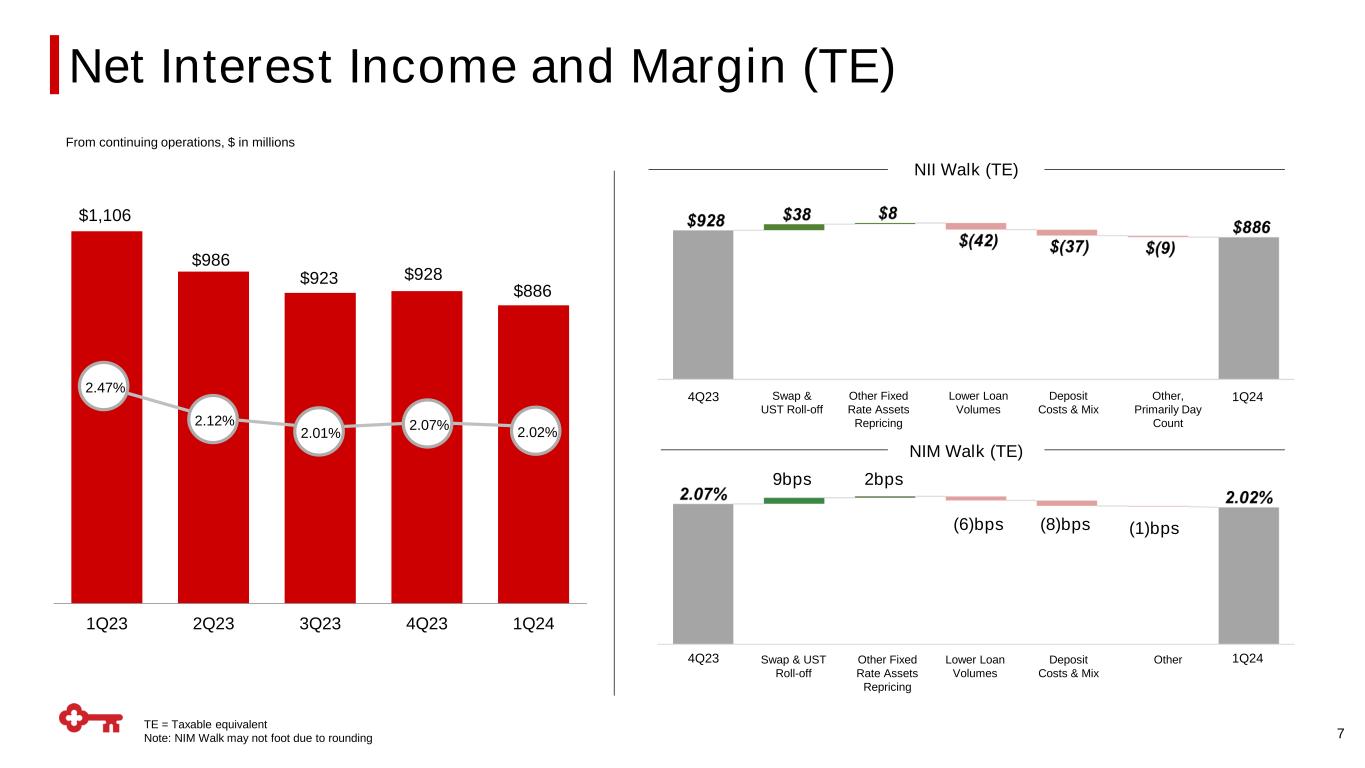 vs. Prior Quarter Deposit Franchise Highlights 6 ▪ Average deposits were down 1.5% from from 4Q23 − Included ~$1Bn decline in brokered CDs − Client deposits down slightly reflecting seasonal outflows in commercial ▪ Client deposits up 2% year-over-year ▪ Total deposit costs rose by 14 basis points − Reflects rollover of MMDAs and CDs at higher rates, and deposit mix shift − Cumulative total interest-bearing deposit beta: ~52%(2) ▪ Commercial deposit balances driven by relationship clients − 78% of commercial deposits in core operating accounts − 95% of commercial deposits have an operating account ▪ Loan-to-deposit ratio: 77%(3) Consumer Other(1) Commercial $84.6 $82.5 $83.9 $84.9 $84.3 $52.2 $51.4 $54.9 $56.9 $56.1 $6.6 $9.0 $6.1 $3.3 $2.5 1Q23 2Q23 3Q23 4Q23 1Q24 $144.8$143.4 $142.9 $145.1 0.99% $142.9 Total deposit cost 1Q24 Product Mix Time deposits Savings Noninterest- bearing Demand 39% 21% 26% 4% 1Q24 Interest-bearing Mix Consumer 21% $ in billions 1.49% 1.88% 2.06% 2.20% 10% MMDA Other Commercial / Treasury Managed Indexed Commercial Wealth 53% 7% ~25% ~15% Note: Graphs may not foot due to rounding (1) Other includes treasury brokered deposits and other deposits; (2) Cumulative beta indexed to 4Q21; (3) Represents period-end consolidated total loans and loans held for sale divided by period-end consolidated total deposits Average Deposits