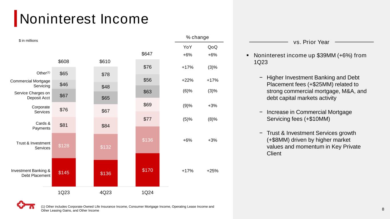 TE = Taxable equivalent Note: NIM Walk may not foot due to rounding 7 1Q23 2Q23 3Q23 4Q23 1Q24 $1,106 $923 $886 NII Walk (TE) NIM Walk (TE) 2.12% $986 $928 2.47% 2.01% 2.07% 2.02% Swap & UST Roll-off Lower Loan Volumes Deposit Costs & Mix Other 4Q23 1Q24 Swap & UST Roll-off Other Fixed Rate Assets Repricing Deposit Costs & Mix Other, Primarily Day Count 4Q23 1Q24 9bps Net Interest Income and Margin (TE) Other Fixed Rate Assets Repricing From continuing operations, $ in millions Lower Loan Volumes 2bps (6)bps (8)bps (1)bps
