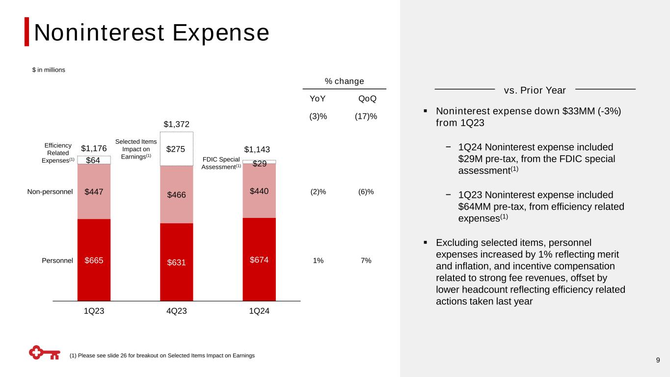 $145 $136 $170 $128 $132 $136 $81 $84 $77 $76 $67 $69 $67 $65 $63 $46 $48 $56 $65 $78 $76 1Q23 4Q23 1Q24 QoQ 8 $608 % change YoY +22% (6)% (9)% +17% (5)% +6% +17% +17% (3)% +3% (3)% (8)% +3% +25% vs. Prior Year $610 $647 +6% +6% $ in millions Investment Banking & Debt Placement Trust & Investment Services Cards & Payments Other(1) Corporate Services Service Charges on Deposit Acct Commercial Mortgage Servicing ▪ Noninterest income up $39MM (+6%) from 1Q23 − Higher Investment Banking and Debt Placement fees (+$25MM) related to strong commercial mortgage, M&A, and debt capital markets activity − Increase in Commercial Mortgage Servicing fees (+$10MM) − Trust & Investment Services growth (+$8MM) driven by higher market values and momentum in Key Private Client (1) Other includes Corporate-Owned Life Insurance Income, Consumer Mortgage Income, Operating Lease Income and Other Leasing Gains, and Other Income Noninterest Income