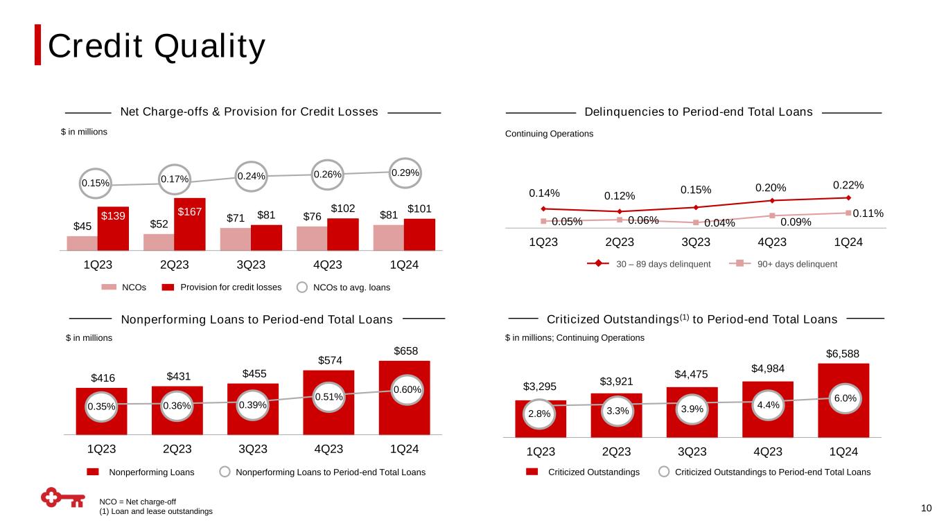 9 $665 $631 $674 $447 $466 $440 $64 $275 $29 $1,176 $1,372 1Q23 4Q23 1Q24 Personnel Non-personnel Selected Items Impact on Earnings(1) vs. Prior Year % change YoY QoQ (2)% 1% (6)% 7% (3)% (17)% ▪ Noninterest expense down $33MM (-3%) from 1Q23 − 1Q24 Noninterest expense included $29M pre-tax, from the FDIC special assessment(1) − 1Q23 Noninterest expense included $64MM pre-tax, from efficiency related expenses(1) ▪ Excluding selected items, personnel expenses increased by 1% reflecting merit and inflation, and incentive compensation related to strong fee revenues, offset by lower headcount reflecting efficiency related actions taken last year $ in millions $1,143 (1) Please see slide 26 for breakout on Selected Items Impact on Earnings FDIC Special Assessment(1) Efficiency Related Expenses(1) Noninterest Expense