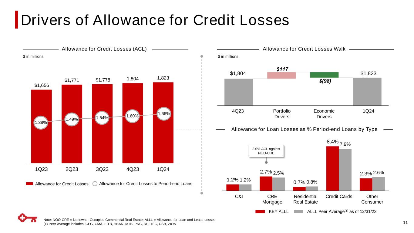 0.14% 0.12% 0.15% 0.20% 0.22% 0.05% 0.06% 0.04% 0.09% 0.11% 1Q23 2Q23 3Q23 4Q23 1Q24 NCO = Net charge-off (1) Loan and lease outstandings 10 $ in millions $3,295 $3,921 $4,475 $4,984 $6,588 1Q23 2Q23 3Q23 4Q23 1Q24 30 – 89 days delinquent 90+ days delinquent Net Charge-offs & Provision for Credit Losses Delinquencies to Period-end Total Loans Criticized Outstandings(1) to Period-end Total Loans $ in millions; Continuing Operations Criticized Outstandings to Period-end Total LoansCriticized Outstandings 2.8% 3.3% 3.9% 4.4% 6.0% $45 $52 $71 $76 $81$139 $167 $81 $102 $101 1Q23 2Q23 3Q23 4Q23 1Q24 NCOs Provision for credit losses NCOs to avg. loans 0.15% 0.17% 0.24% 0.26% 0.29% $416 $431 $455 $574 $658 1Q23 2Q23 3Q23 4Q23 1Q24 Nonperforming Loans to Period-end Total Loans $ in millions Nonperforming Loans to Period-end Total LoansNonperforming Loans 0.35% 0.36% 0.39% 0.51% 0.60% Credit Quality Continuing Operations