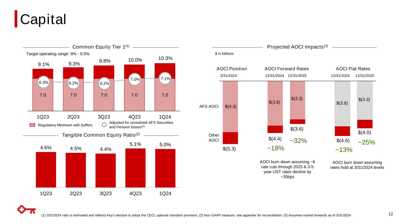1.2% 2.7% 0.7% 8.4% 2.3% 1.2% 2.5% 0.8% 7.9% 2.6% C&I CRE Mortgage Residential Real Estate Credit Cards Other Consumer ALLL Peer Average(1) as of 12/31/23KEY ALLL $1,656 $1,771 $1,778 1,804 1,823 1Q23 2Q23 3Q23 4Q23 1Q24 11 Portfolio Drivers Economic Drivers Allowance for Credit Losses Walk 4Q23 $1,804 $1,823 1Q24 Allowance for Credit Losses to Period-end LoansAllowance for Credit Losses $ in millions Allowance for Credit Losses (ACL) 1.38% 1.49% 1.54% 1.60% 1.66% Allowance for Loan Losses as % Period-end Loans by Type $ in millions 3.0% ACL against NOO-CRE Drivers of Allowance for Credit Losses Note: NOO-CRE = Nonowner Occupied Commercial Real Estate; ALLL = Allowance for Loan and Lease Losses (1) Peer Average includes: CFG, CMA, FITB, HBAN, MTB, PNC, RF, TFC, USB, ZION