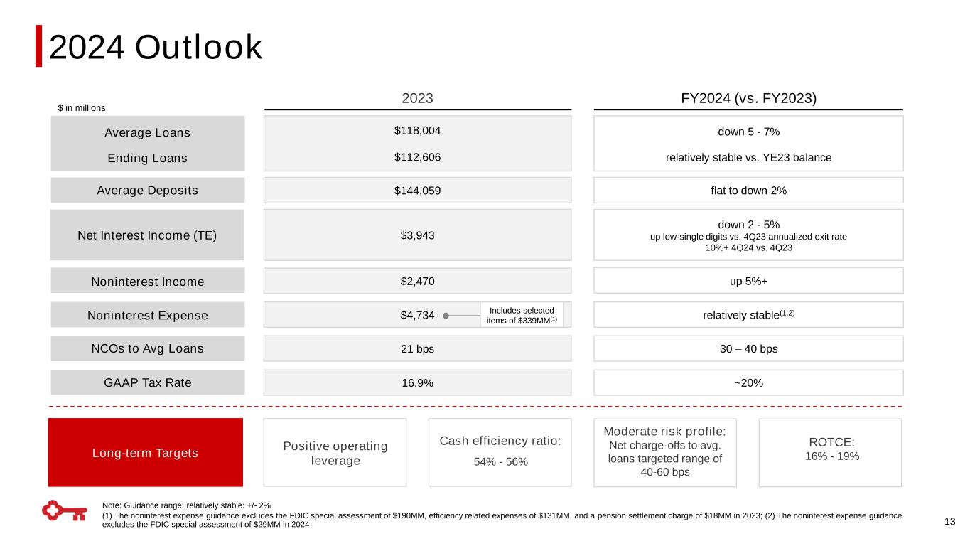 AFS AOCI 7.0 7.0 7.0 7.0 7.0 1Q23 2Q23 3Q23 4Q23 1Q24 12 $ in billions $(5.3) $(4.4) $(4.6) ~18% ~32% $(3.6) $(4.0) AOCI Forward Rates 12/31/2024 12/31/2025 AOCI Flat Rates 12/31/2024 12/31/2025 AOCI Position 3/31/2024 ~13% ~25% AOCI burn down assuming ~6 rate cuts through 2025 & 3-5 year UST rates decline by ~35bps AOCI burn down assuming rates hold at 3/31/2024 levels Tangible Common Equity Ratio(2) Common Equity Tier 1(1) Projected AOCI Impacts(3) 4.6% 4.5% 4.4% 5.1% 5.0% 1Q23 2Q23 3Q23 4Q23 1Q24 Regulatory Minimum with buffers 9.1% 9.3% 9.8% 10.0% Target operating range: 9% - 9.5% $(3.8) $(3.3) $(3.8) $(3.3) 10.3% Adjusted for unrealized AFS Securities and Pension losses(2) $(4.3) Other AOCI 6.3% 6.2% 6.2% 7.0% 7.1% (1) 3/31/2024 ratio is estimated and reflects Key's election to adopt the CECL optional transition provision; (2) Non-GAAP measure: see appendix for reconciliation; (3) Assumes market forwards as of 3/31/2024 Capital