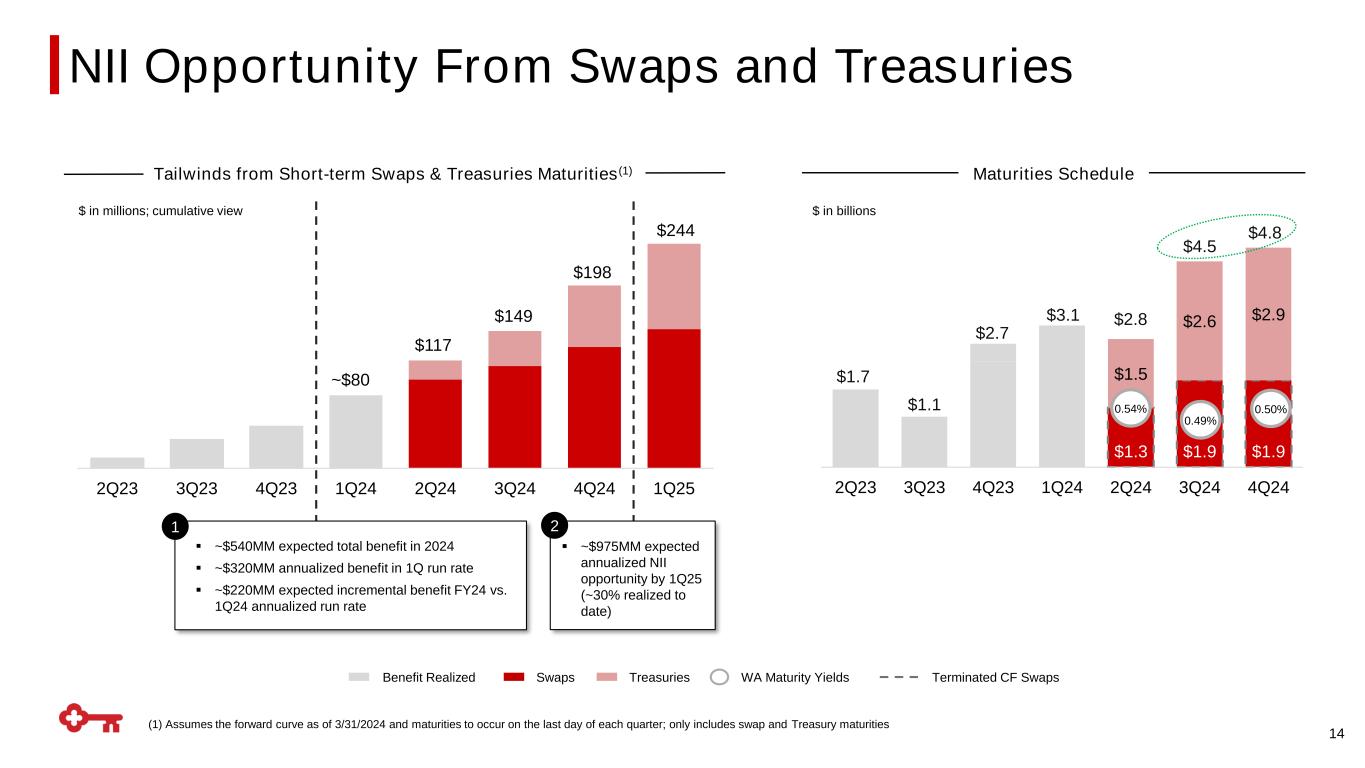 FY2024 (vs. FY2023)2023 13 Note: Guidance range: relatively stable: +/- 2% (1) The noninterest expense guidance excludes the FDIC special assessment of $190MM, efficiency related expenses of $131MM, and a pension settlement charge of $18MM in 2023; (2) The noninterest expense guidance excludes the FDIC special assessment of $29MM in 2024 $118,004 $112,606 Average Loans Ending Loans Noninterest Income Noninterest Expense NCOs to Avg Loans GAAP Tax Rate down 5 - 7% relatively stable vs. YE23 balance Long-term Targets $144,059 $3,943 Positive operating leverage Cash efficiency ratio: 54% - 56% Moderate risk profile: Net charge-offs to avg. loans targeted range of 40-60 bps ROTCE: 16% - 19% flat to down 2% down 2 - 5% up low-single digits vs. 4Q23 annualized exit rate 10%+ 4Q24 vs. 4Q23 up 5%+ relatively stable(1,2) 30 – 40 bps Average Deposits $2,470 $4,734 21 bps 16.9% ~20% $ in millions 2024 Outlook Net Interest Income (TE) Includes selected items of $339MM(1)