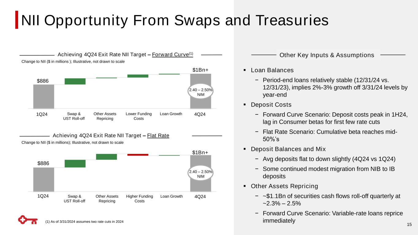 $1.3 $1.9 $1.9 $1.5 $2.6 $2.9 2Q23 3Q23 4Q23 1Q24 2Q24 3Q24 4Q24 (1) Assumes the forward curve as of 3/31/2024 and maturities to occur on the last day of each quarter; only includes swap and Treasury maturities 14 Treasuries Swaps $3.1 $2.8 $4.5 $4.8 $2.7 $1.7 $1.1 Benefit Realized WA Maturity Yields $ in billions ▪ ~$540MM expected total benefit in 2024 ▪ ~$320MM annualized benefit in 1Q run rate ▪ ~$220MM expected incremental benefit FY24 vs. 1Q24 annualized run rate 1 Tailwinds from Short-term Swaps & Treasuries Maturities(1) Maturities Schedule 2Q23 3Q23 4Q23 1Q24 2Q24 3Q24 4Q24 1Q25 $117 $149 $198 $244 0.54% 0.49% 0.50% $ in millions; cumulative view Terminated CF Swaps ▪ ~$975MM expected annualized NII opportunity by 1Q25 (~30% realized to date) 2 ~$80 NII Opportunity From Swaps and Treasuries