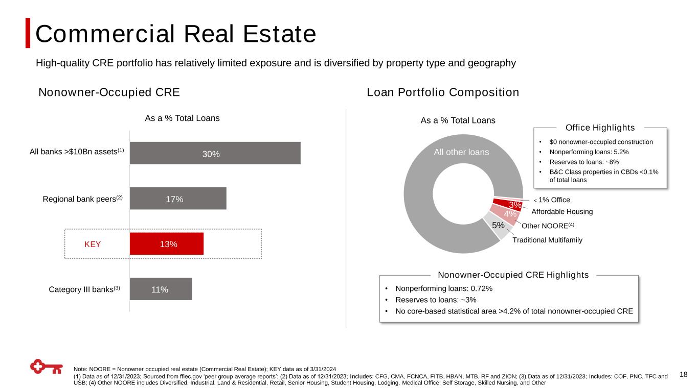 Brokered Deposits ▪ Proactive balance sheet management − Right-sized the balance sheet − Significantly increased CET1 through RWA optimization − Vastly improved liquidity and funding profile ▪ Targeted expense reductions to hold expenses relatively stable − Simplified and streamlined businesses 17 ▪ Franchise momentum: client growth, consistent business flows, strong deposit base ▪ Upside to capital markets recovery ▪ Strengths play to market trends − Strong fee-based businesses − Underwrite-to-distribute business model ▪ Core funded balance sheet more resilient to changes in interest rates ▪ Outsized fixed asset repricing benefit from the roll-off of swaps and Treasuries ▪ High-quality portfolio with strong credit quality − Low exposure to leveraged lending, office, and construction Repositioned Company in 2023 Well-Positioned Moving Forward $34 $24 45016 45382 1Q23 1Q24 31% 3/31/23 3/31/24 3/31/23 3/31/24 Wholesale Funding(1) 62% (1) Wholesale funding includes Federal funds purchased and securities sold under repurchase agreements, bank notes and other short-term borrowings, and long-term debt Positioned for the Future $in billions $in billions $8 $3