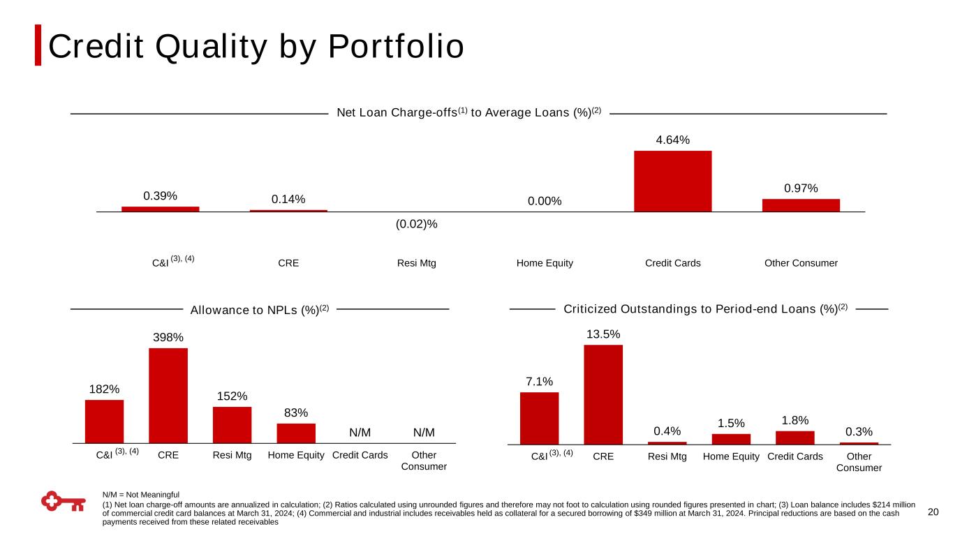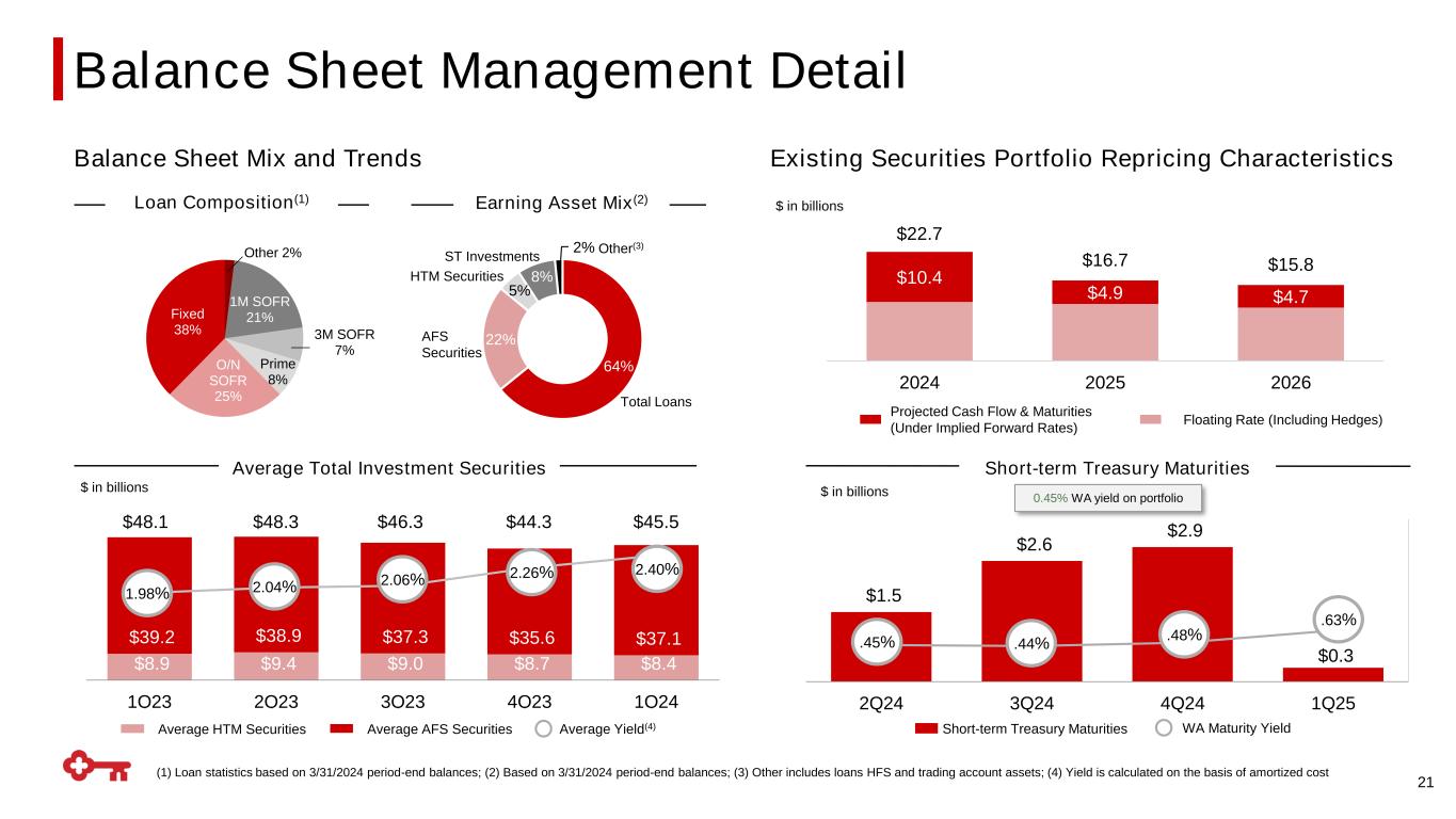 0.39% 0.14% (0.02)% 0.00% 4.64% 0.97% C&I CRE Resi Mtg Home Equity Credit Cards Other Consumer 20 Net Loan Charge-offs(1) to Average Loans (%)(2) Allowance to NPLs (%)(2) Criticized Outstandings to Period-end Loans (%)(2) 182% 398% 152% 83% N/M N/M C&I CRE Resi Mtg Home Equity Credit Cards Other Consumer 7.1% 13.5% 0.4% 1.5% 1.8% 0.3% C&I CRE Resi Mtg Home Equity Credit Cards Other Consumer Credit Quality by Portfolio (3), (4) (3), (4) (3), (4) N/M = Not Meaningful (1) Net loan charge-off amounts are annualized in calculation; (2) Ratios calculated using unrounded figures and therefore may not foot to calculation using rounded figures presented in chart; (3) Loan balance includes $214 million of commercial credit card balances at March 31, 2024; (4) Commercial and industrial includes receivables held as collateral for a secured borrowing of $349 million at March 31, 2024. Principal reductions are based on the cash payments received from these related receivables