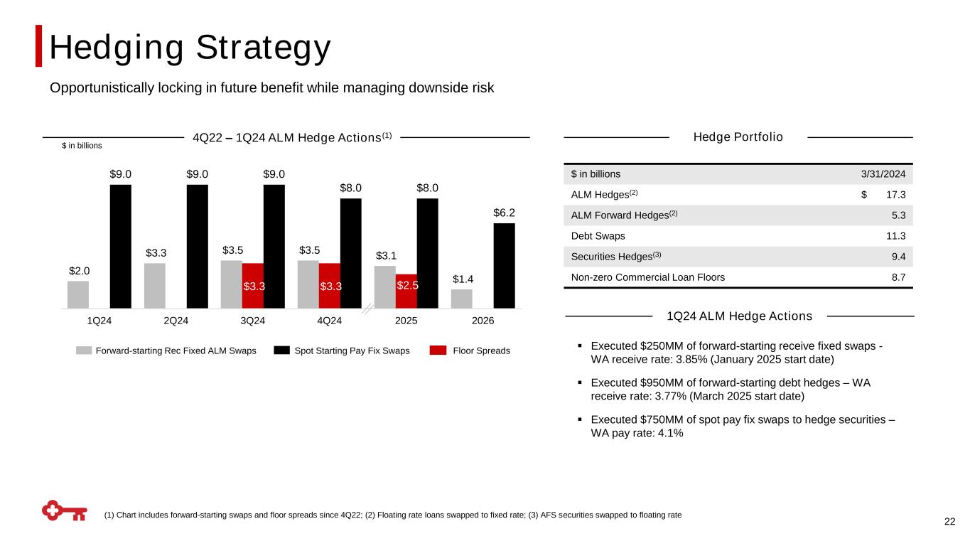 $1.5 $2.6 $2.9 $0.3 2Q24 3Q24 4Q24 1Q25 Prime 8% 1M SOFR 21% 3M SOFR 7% O/N SOFR 25% Fixed 38% Other 2% Loan Composition(1) Earning Asset Mix(2) 64% 22% 5% 8% 2% Total Loans AFS Securities Other(3) $8.9 $9.4 $9.0 $8.7 $8.4 $39.2 $38.9 $37.3 $35.6 $37.1 1Q23 2Q23 3Q23 4Q23 1Q24 Average AFS Securities Average Yield(4)Average HTM Securities $ in billions Average Total Investment Securities Balance Sheet Mix and Trends $48.1 $46.3 $44.3 (1) Loan statistics based on 3/31/2024 period-end balances; (2) Based on 3/31/2024 period-end balances; (3) Other includes loans HFS and trading account assets; (4) Yield is calculated on the basis of amortized cost Projected Cash Flow & Maturities (Under Implied Forward Rates) Floating Rate (Including Hedges) Existing Securities Portfolio Repricing Characteristics $ in billions 0.45% WA yield on portfolio $ in billions Short-term Treasury Maturities WA Maturity Yield Short-term Treasury Maturities 21 1.98% 2.04% 2.06% 2.26% .45% .44% .48% .63% Balance Sheet Management Detail $10.4 $4.9 $4.7 $22.7 $16.7 $15.8 2024 2025 2026 2.40% $45.5$48.3 ST Investments HTM Securities