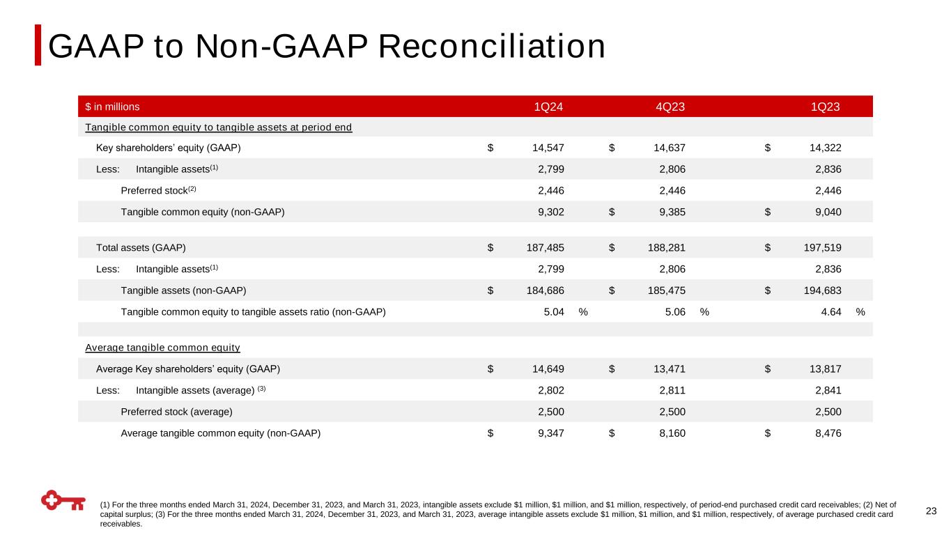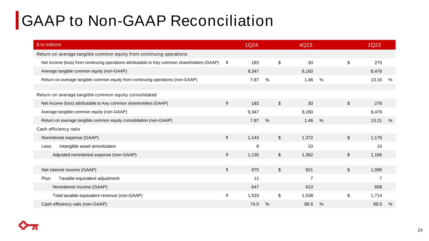 GAAP to Non-GAAP Reconciliation (1) For the three months ended March 31, 2024, December 31, 2023, and March 31, 2023, intangible assets exclude $1 million, $1 million, and $1 million, respectively, of period-end purchased credit card receivables; (2) Net of capital surplus; (3) For the three months ended March 31, 2024, December 31, 2023, and March 31, 2023, average intangible assets exclude $1 million, $1 million, and $1 million, respectively, of average purchased credit card receivables. 23 $ in millions 1Q24 4Q23 1Q23 Tangible common equity to tangible assets at period end Key shareholders’ equity (GAAP) $ 14,547 $ 14,637 $ 14,322 Less: Intangible assets(1) 2,799 2,806 2,836 Preferred stock(2) 2,446 2,446 2,446 Tangible common equity (non-GAAP) 9,302 $ 9,385 $ 9,040 Total assets (GAAP) $ 187,485 $ 188,281 $ 197,519 Less: Intangible assets(1) 2,799 2,806 2,836 Tangible assets (non-GAAP) $ 184,686 $ 185,475 $ 194,683 Tangible common equity to tangible assets ratio (non-GAAP) 5.04 % 5.06 % 4.64 % Average tangible common equity Average Key shareholders’ equity (GAAP) $ 14,649 $ 13,471 $ 13,817 Less: Intangible assets (average) (3) 2,802 2,811 2,841 Preferred stock (average) 2,500 2,500 2,500 Average tangible common equity (non-GAAP) $ 9,347 $ 8,160 $ 8,476