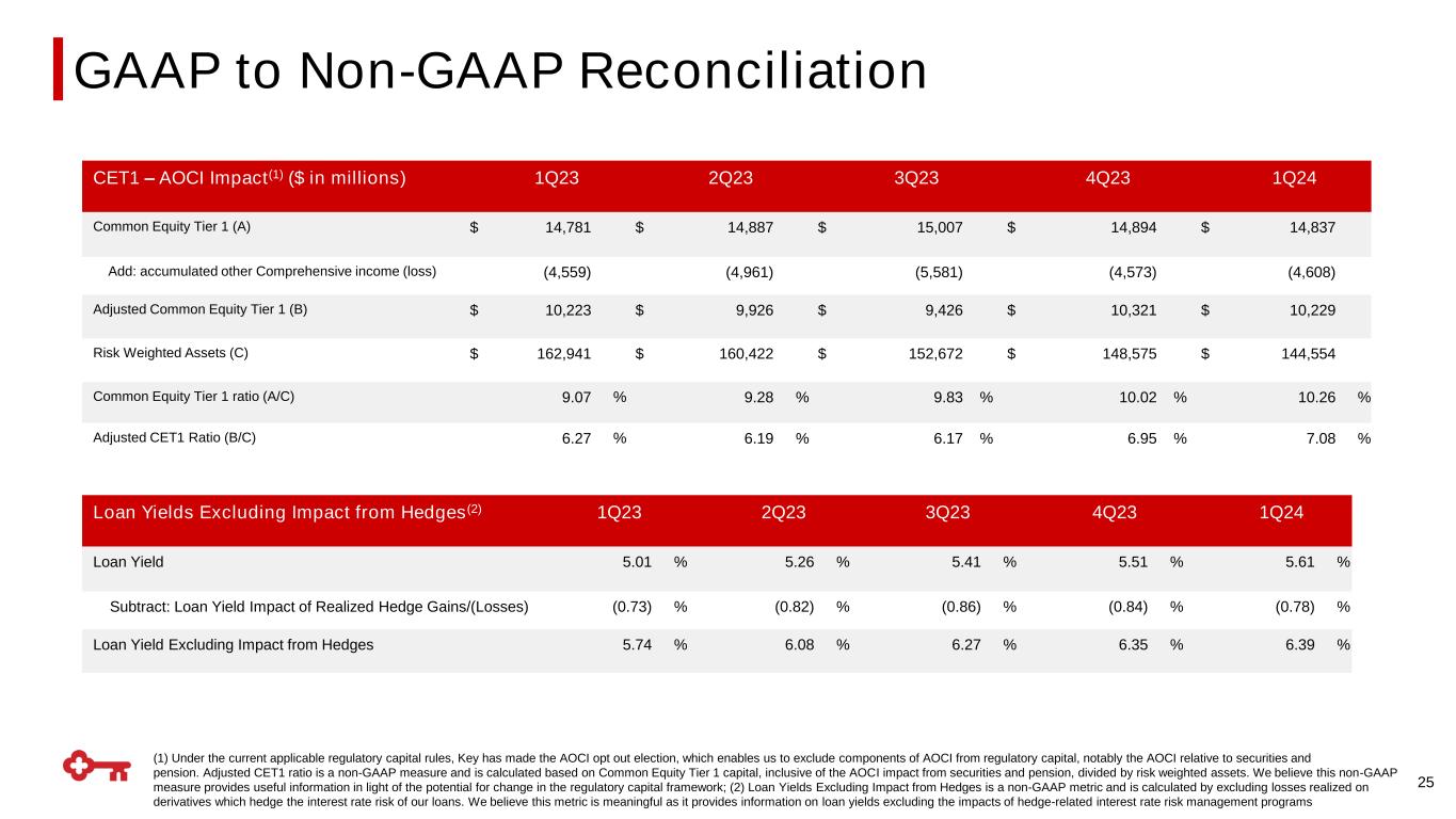 GAAP to Non-GAAP Reconciliation 24 $ in millions 1Q24 4Q23 1Q23 Return on average tangible common equity from continuing operations Net income (loss) from continuing operations attributable to Key common shareholders (GAAP) $ 183 $ 30 $ 275 Average tangible common equity (non-GAAP) 9,347 8,160 8,476 Return on average tangible common equity from continuing operations (non-GAAP) 7.87 % 1.46 % 13.16 % Return on average tangible common equity consolidated Net income (loss) attributable to Key common shareholders (GAAP) $ 183 $ 30 $ 276 Average tangible common equity (non-GAAP) 9,347 8,160 8,476 Return on average tangible common equity consolidation (non-GAAP) 7.87 % 1.46 % 13.21 % Cash efficiency ratio Noninterest expense (GAAP) $ 1,143 $ 1,372 $ 1,176 Less: Intangible asset amortization 8 10 10 Adjusted noninterest expense (non-GAAP) $ 1,135 $ 1,362 $ 1,166 Net interest income (GAAP) $ 875 $ 921 $ 1,099 Plus: Taxable-equivalent adjustment 11 7 7 Noninterest income (GAAP) 647 610 608 Total taxable-equivalent revenue (non-GAAP) $ 1,533 $ 1,538 $ 1,714 Cash efficiency ratio (non-GAAP) 74.0 % 88.6 % 68.0 %