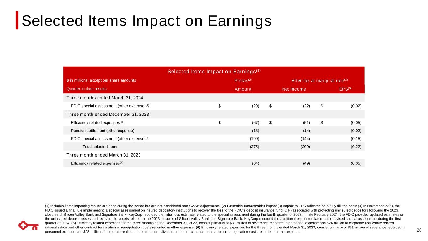 (1) Includes items impacting results or trends during the period but are not considered non-GAAP adjustments. (2) Favorable (unfavorable) impact (3) Impact to EPS reflected on a fully diluted basis (4) In November 2023, the FDIC issued a final rule implementing a special assessment on insured depository institutions to recover the loss to the FDIC’s deposit insurance fund (DIF) associated with protecting uninsured depositors following the 2023 closures of Silicon Valley Bank and Signature Bank. KeyCorp recorded the initial loss estimate related to the special assessment during the fourth quarter of 2023. In late February 2024, the FDIC provided updated estimates on the uninsured deposit losses and recoverable assets related to the 2023 closures of Silicon Valley Bank and Signature Bank. KeyCorp recorded the additional expense related to the revised special assessment during the first quarter of 2024. (5) Efficiency related expenses for the three months ended December 31, 2023, consist primarily of $39 million of severance recorded in personnel expense and $24 million of corporate real estate related rationalization and other contract termination or renegotiation costs recorded in other expense. (6) Efficiency related expenses for the three months ended March 31, 2023, consist primarily of $31 million of severance recorded in personnel expense and $28 million of corporate real estate related rationalization and other contract termination or renegotiation costs recorded in other expense. 26 Selected Items Impact on Earnings(1) $ in millions, except per share amounts Pretax(2) After-tax at marginal rate(2) Quarter to date results Amount Net Income EPS(3) Three months ended March 31, 2024 FDIC special assessment (other expense)(4) $ (29) $ (22) $ (0.02) Three month ended December 31, 2023 Efficiency related expenses (5) $ (67) $ (51) $ (0.05) Pension settlement (other expense) (18) (14) (0.02) FDIC special assessment (other expense)(4) (190) (144) (0.15) Total selected items (275) (209) (0.22) Three month ended March 31, 2023 Efficiency related expenses(6) (64) (49) (0.05) Selected Items Impact on Earnings