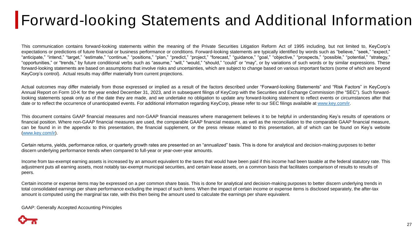 This communication contains forward-looking statements within the meaning of the Private Securities Litigation Reform Act of 1995 including, but not limited to, KeyCorp’s expectations or predictions of future financial or business performance or conditions. Forward-looking statements are typically identified by words such as “believe,” “seek,” “expect,” “anticipate,” “intend,” “target,” “estimate,” “continue,” “positions,” “plan,” “predict,” “project,” “forecast,” “guidance,” “goal,” “objective,” “prospects,” “possible,” “potential,” “strategy,” “opportunities,” or “trends,” by future conditional verbs such as “assume,” “will,” “would,” “should,” “could” or “may”, or by variations of such words or by similar expressions. These forward-looking statements are based on assumptions that involve risks and uncertainties, which are subject to change based on various important factors (some of which are beyond KeyCorp’s control). Actual results may differ materially from current projections. Actual outcomes may differ materially from those expressed or implied as a result of the factors described under “Forward-looking Statements” and “Risk Factors” in KeyCorp’s Annual Report on Form 10-K for the year ended December 31, 2023, and in subsequent filings of KeyCorp with the Securities and Exchange Commission (the “SEC”). Such forward- looking statements speak only as of the date they are made, and we undertake no obligation to update any forward-looking statement to reflect events or circumstances after that date or to reflect the occurrence of unanticipated events. For additional information regarding KeyCorp, please refer to our SEC filings available at www.key.com/ir. This document contains GAAP financial measures and non-GAAP financial measures where management believes it to be helpful in understanding Key’s results of operations or financial position. Where non-GAAP financial measures are used, the comparable GAAP financial measure, as well as the reconciliation to the comparable GAAP financial measure, can be found in in the appendix to this presentation, the financial supplement, or the press release related to this presentation, all of which can be found on Key’s website (www.key.com/ir). Certain returns, yields, performance ratios, or quarterly growth rates are presented on an “annualized” basis. This is done for analytical and decision-making purposes to better discern underlying performance trends when compared to full-year or year-over-year amounts. Income from tax-exempt earning assets is increased by an amount equivalent to the taxes that would have been paid if this income had been taxable at the federal statutory rate. This adjustment puts all earning assets, most notably tax-exempt municipal securities, and certain lease assets, on a common basis that facilitates comparison of results to results of peers. Certain income or expense items may be expressed on a per common share basis. This is done for analytical and decision-making purposes to better discern underlying trends in total consolidated earnings per share performance excluding the impact of such items. When the impact of certain income or expense items is disclosed separately, the after-tax amount is computed using the marginal tax rate, with this then being the amount used to calculate the earnings per share equivalent. GAAP: Generally Accepted Accounting Principles 27 Forward-looking Statements and Additional Information