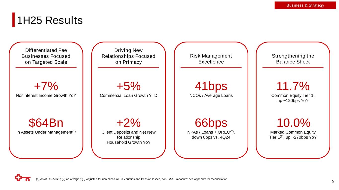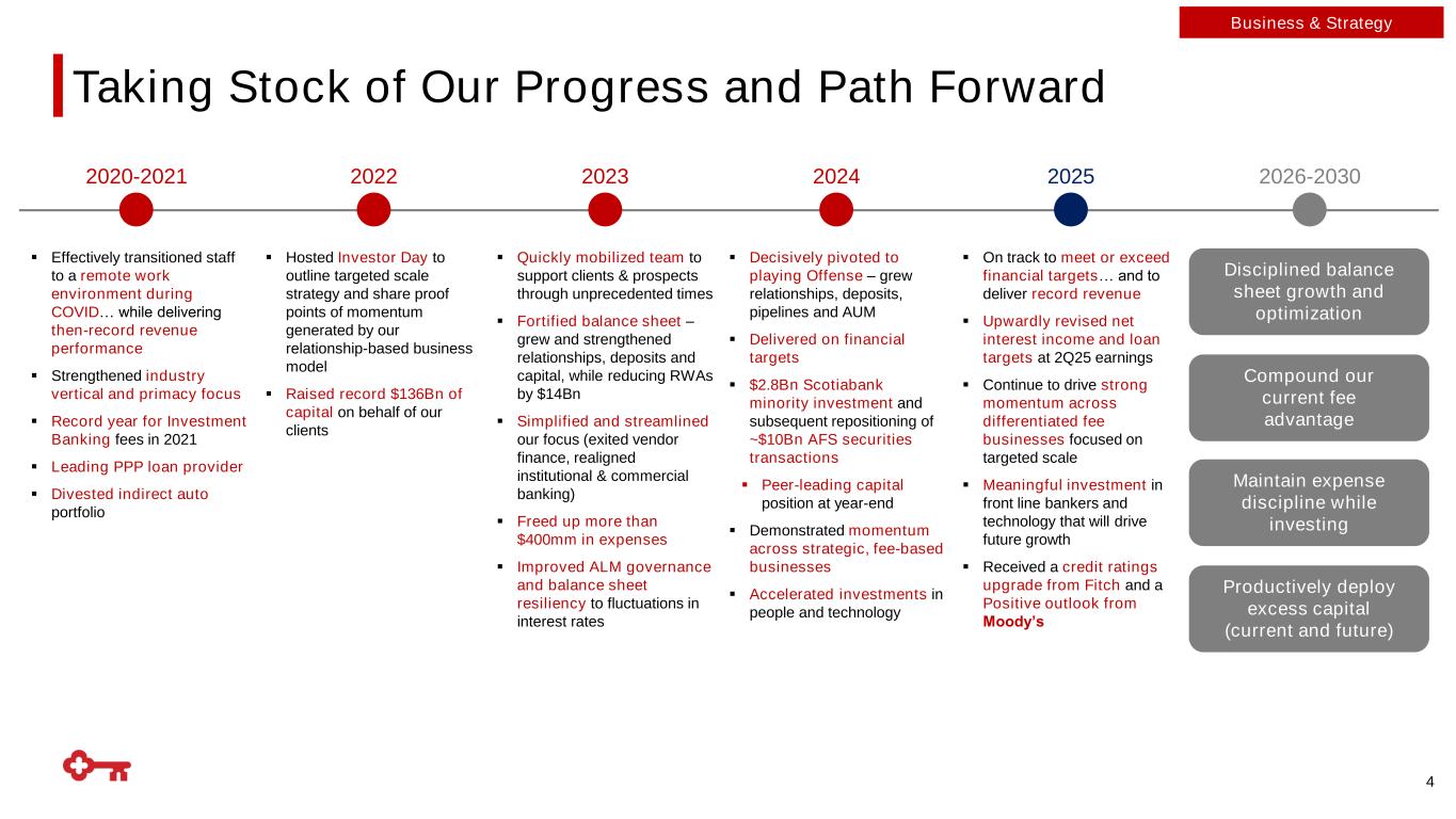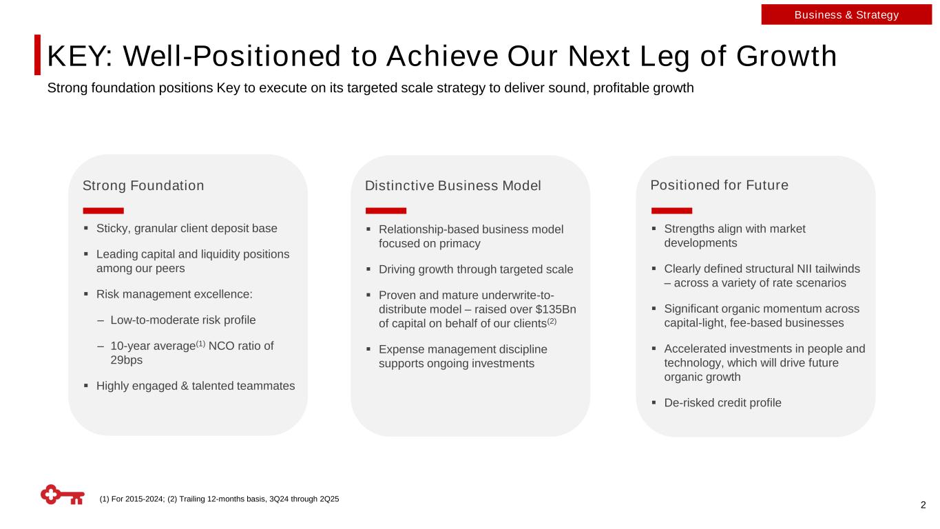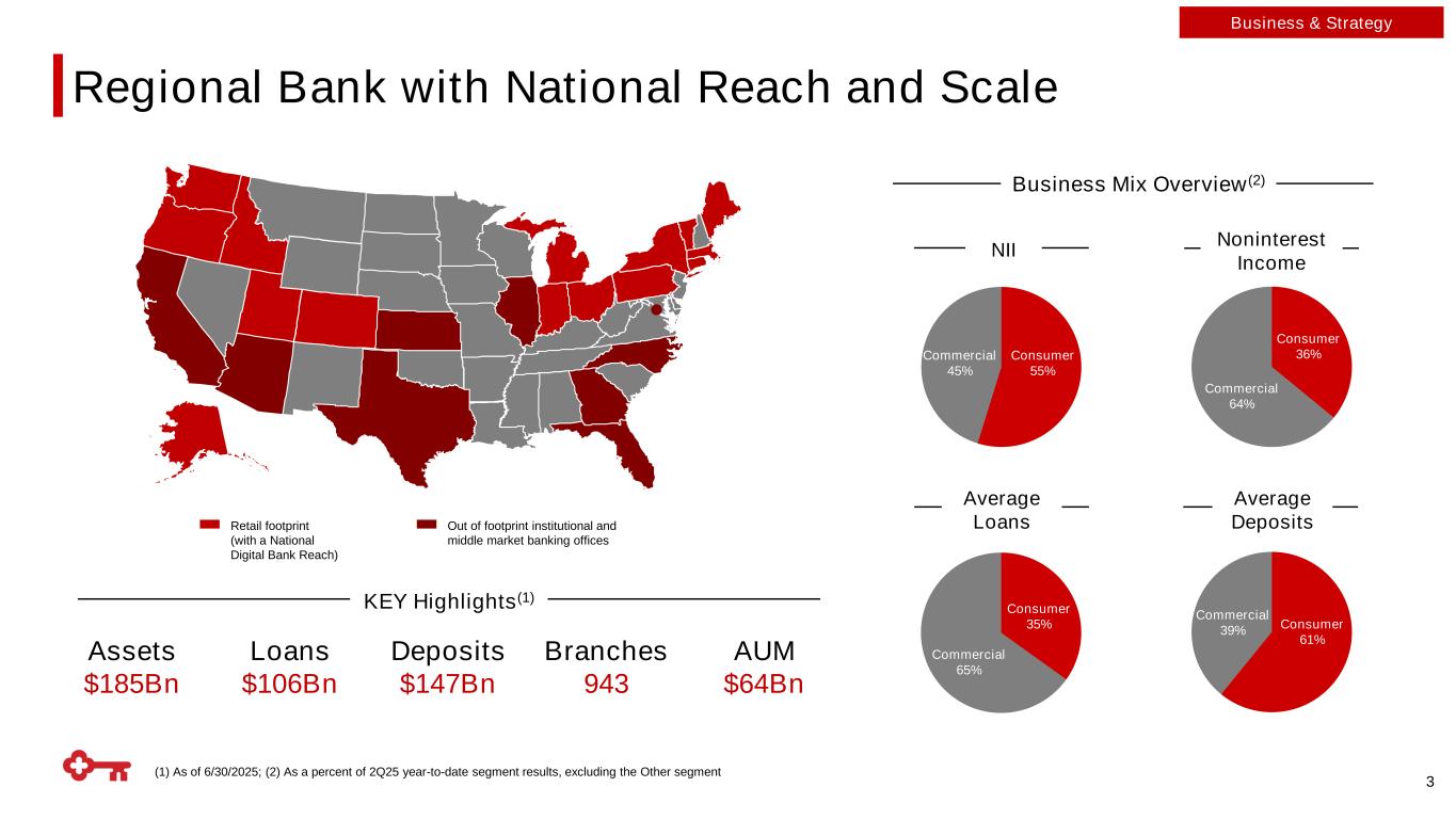 (1) As of 6/30/2025; (2) As a percent of 2Q25 year-to-date segment results, excluding the Other segment Regional Bank with National Reach and Scale Business Mix Overview(2) Retail footprint (with a National Digital Bank Reach) Assets $185Bn Deposits $147Bn KEY Highlights(1) Loans $106Bn Branches 943 AUM $64Bn Out of footprint institutional and middle market banking offices 3 Consumer 55% Commercial 45% NII Commercial 64% Consumer 36% Noninterest Income Consumer 35% Commercial 65% Average Loans Consumer 61% Commercial 39% Average Deposits Business & Strategy