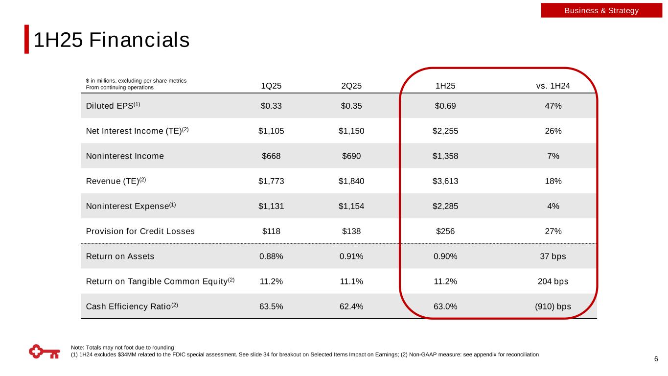 (1) As of 6/30/2025; (2) As of 2Q25; (3) Adjusted for unrealized AFS Securities and Pension losses, non-GAAP measure: see appendix for reconciliation +7% Noninterest Income Growth YoY $64Bn In Assets Under Management(1) Differentiated Fee Businesses Focused on Targeted Scale +5% Commercial Loan Growth YTD +2% Client Deposits and Net New Relationship Household Growth YoY Driving New Relationships Focused on Primacy 11.7% Common Equity Tier 1, up ~120bps YoY 10.0% Marked Common Equity Tier 1(3), up ~270bps YoY Strengthening the Balance Sheet Risk Management Excellence 66bps NPAs / Loans + OREO(2), down 8bps vs. 4Q24 41bps NCOs / Average Loans 5 Business & Strategy 1H25 Results