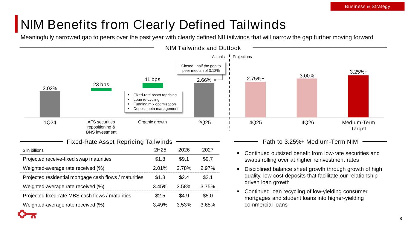 Business & Strategy (1) Change in total population from 2024 through 2029 2016-2019 Avg Annual Growth 2020-2024 Avg Annual Growth population growth in Key’s Western markets vs. non-footprint states over the next 4 years(1) ~2x of new households in 2025 are under the age of 45 60% We have a relationship-focused business model with unique, targeted capabilities to best serve consumer and commercial clients A Differentiated Full-Service Commercial Platform Capabilities Scaled Holistic Platform (Commercial Payments, Capital Markets, and Wealth) Industry Expertise (Healthcare, Technology, Energy, Industrials, Consumer, Real Estate, Public Sector) Integrated Delivery Model Regional Banks Trillionaire Banks Boutiques Middle Market Focus Strong Consumer Foundation Relationship Household Progress 7 National Digital Bank Reach Retail footprint Strong Foundation Provides Opportunities For Growth <1% >3% of relationship households acquired since 2019 22% Growth in Consumer Deposits since 4Q19 +$14Bn