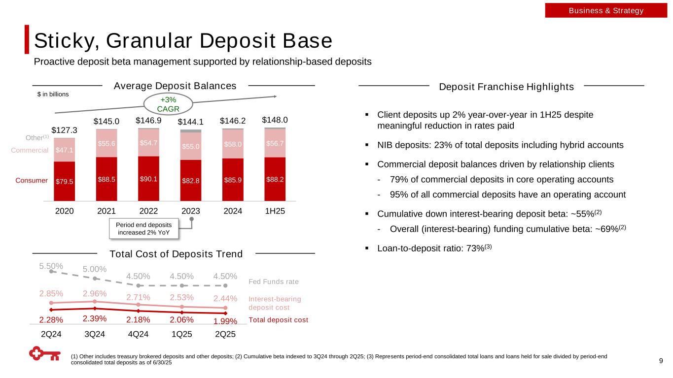2.02% 2.66% 3.00% 1Q24 AFS repositioning & BNS … Organic growth 2Q25 4Q25 4Q26 Medium-Term Target NIM Benefits from Clearly Defined Tailwinds 8 NIM Tailwinds and Outlook Business & Strategy 1Q24 AFS securities repositioning & BNS investment Organic growth 5 23 bps 41 bps $ in billions 2H25 2026 2027 Projected receive-fixed swap maturities $1.8 $9.1 $9.7 Weighted-average rate received (%) 2.01% 2.78% 2.97% Projected residential mortgage cash flows / maturities $1.3 $2.4 $2.1 Weighted-average rate received (%) 3.45% 3.58% 3.75% Projected fixed-rate MBS cash flows / maturities $2.5 $4.9 $5.0 Weighted-average rate received (%) 3.49% 3.53% 3.65% Fixed-Rate Asset Repricing Tailwinds Meaningfully narrowed gap to peers over the past year with clearly defined NII tailwinds that will narrow the gap further moving forward Closed ~half the gap to peer median of 3.12% 2.75%+ 3.25%+ 4Q25 6 Medium-Term Target Path to 3.25%+ Medium-Term NIM ▪ Continued outsized benefit from low-rate securities and swaps rolling over at higher reinvestment rates ▪ Disciplined balance sheet growth through growth of high quality, low-cost deposits that facilitate our relationship- driven loan growth ▪ Continued loan recycling of low-yielding consumer mortgages and student loans into higher-yielding commercial loans ▪ Fixed-rate asset repricing ▪ Loan re-cycling ▪ Funding mix optimization ▪ Deposit beta management ProjectionsActuals
